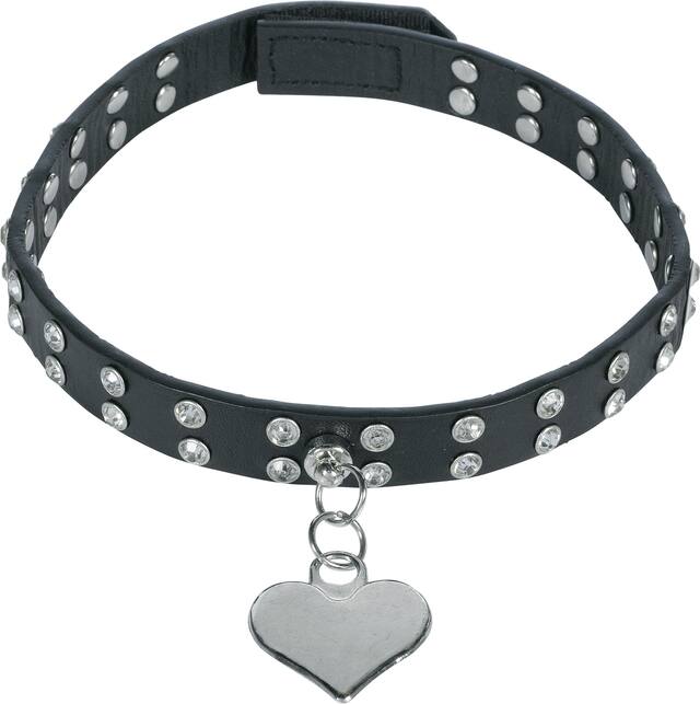 Deluxe Fancy Cat Collar features a faux leather black choker-style collar that is dotted with rhinestones and a metal heart dangling at the centre