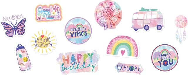 Include a butterfly a dream catcher a rainbow, and other groovy images with headlines such as "Good Vibes" and "Radiate positivity"
