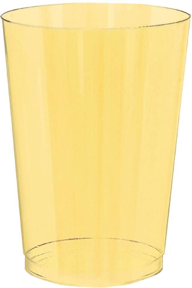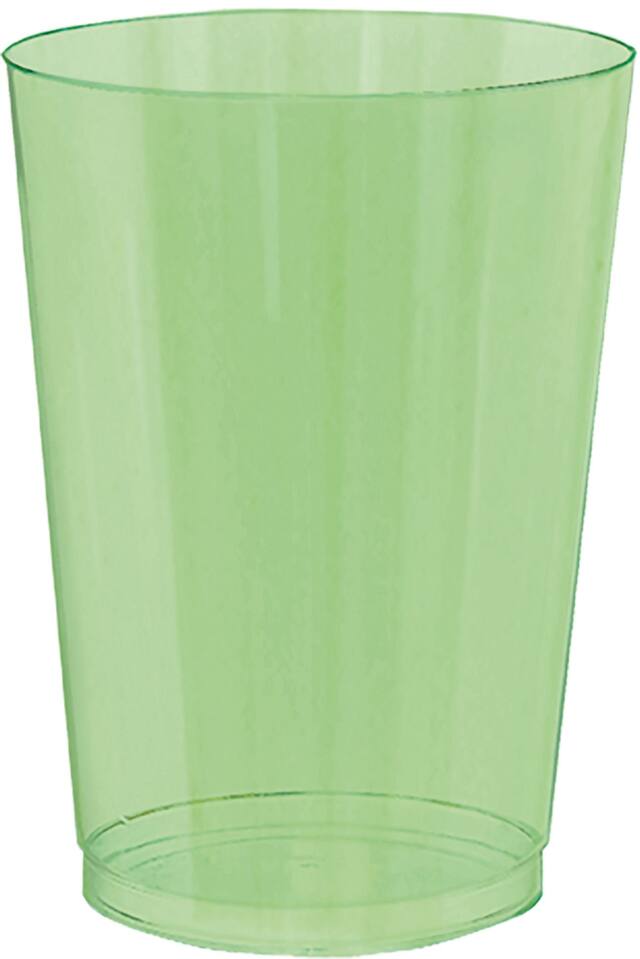 In a festive colour scheme of green, purple, and gold, these transparent plastic cups are just the right size for cocktails