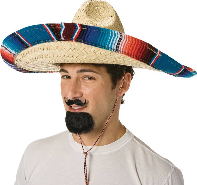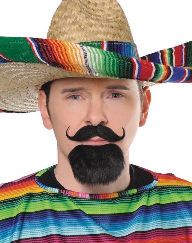 Prepare to get your mariachi on with the included small, dark moustache with twirled ends and a matching thick goatee