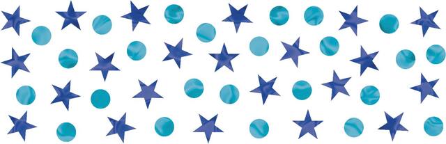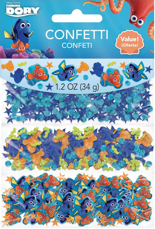 • Finding Dory Confetti features stars, circles, Nemo, and Dory in a blue, orange, and gold colour theme