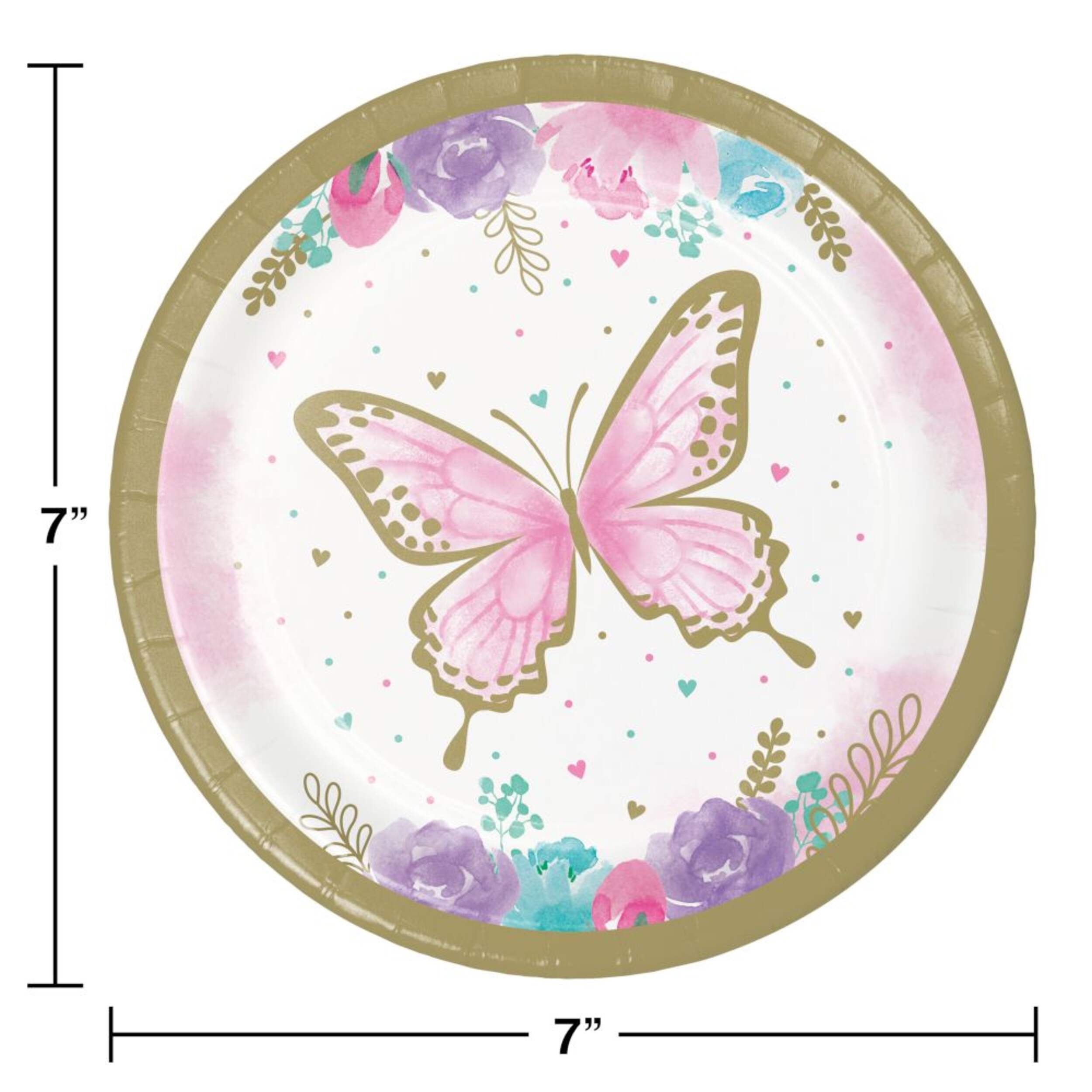 The plates feature a pretty pink butterfly accented by metallic gold touches, as well as pastel and gold flowers, leaves, and hearts