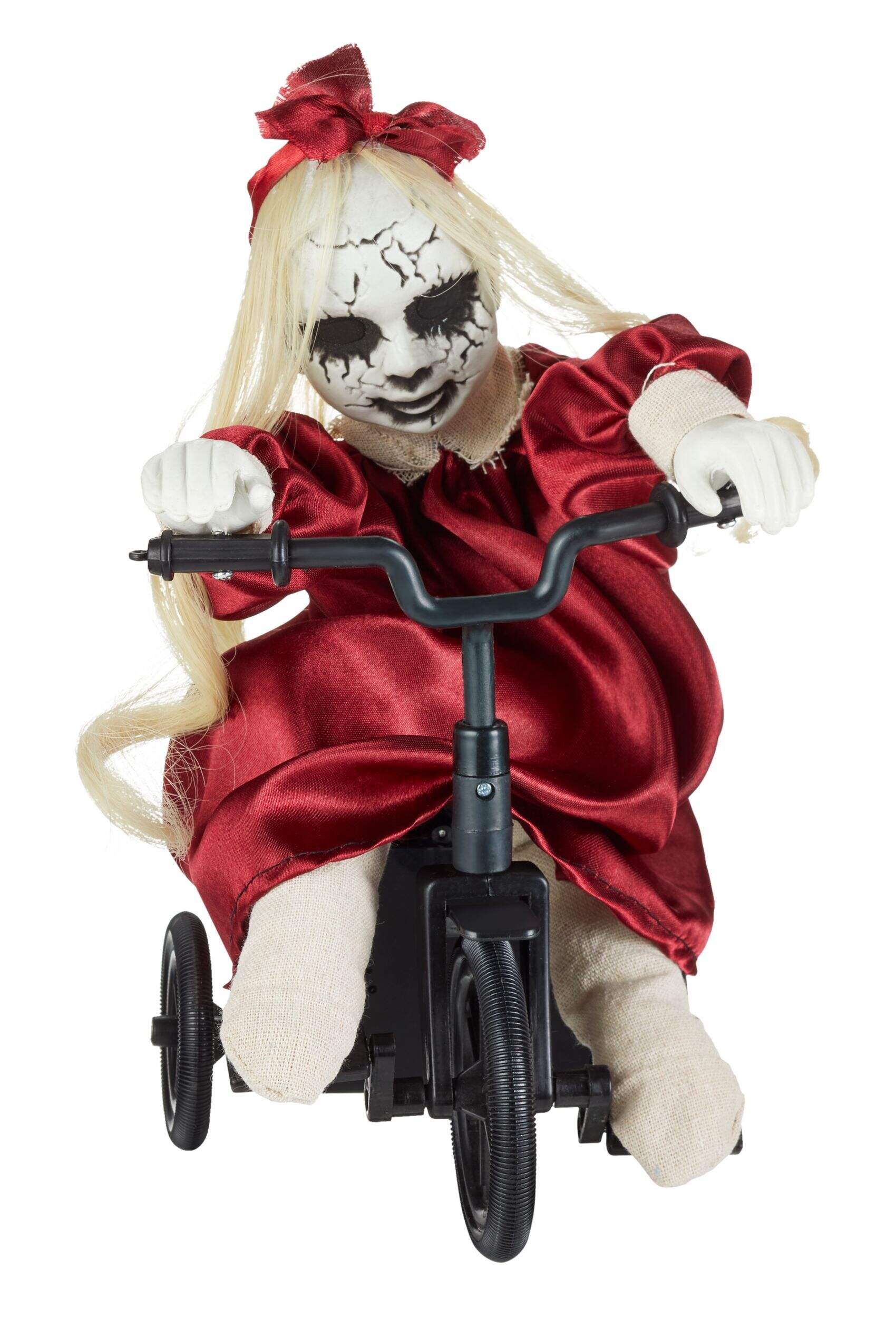 You may be interested in these similar products shown below.Spook your friends and family this Halloween with the For Living Animated Girl on Bike with Sound Sensor, LED Lights for Halloween, Red, 12 1/2-in. This goofy Halloween icon features an animated girl sitting on a bike. When operated, it moves backward and forwards with a spooky sound while the superbright LED cast light on the girl. The Halloween figure features a reliable sound sensor to emit a scary sound. With her ghostly, mysterious presence, she is sure to make a perfect Halloween display.
