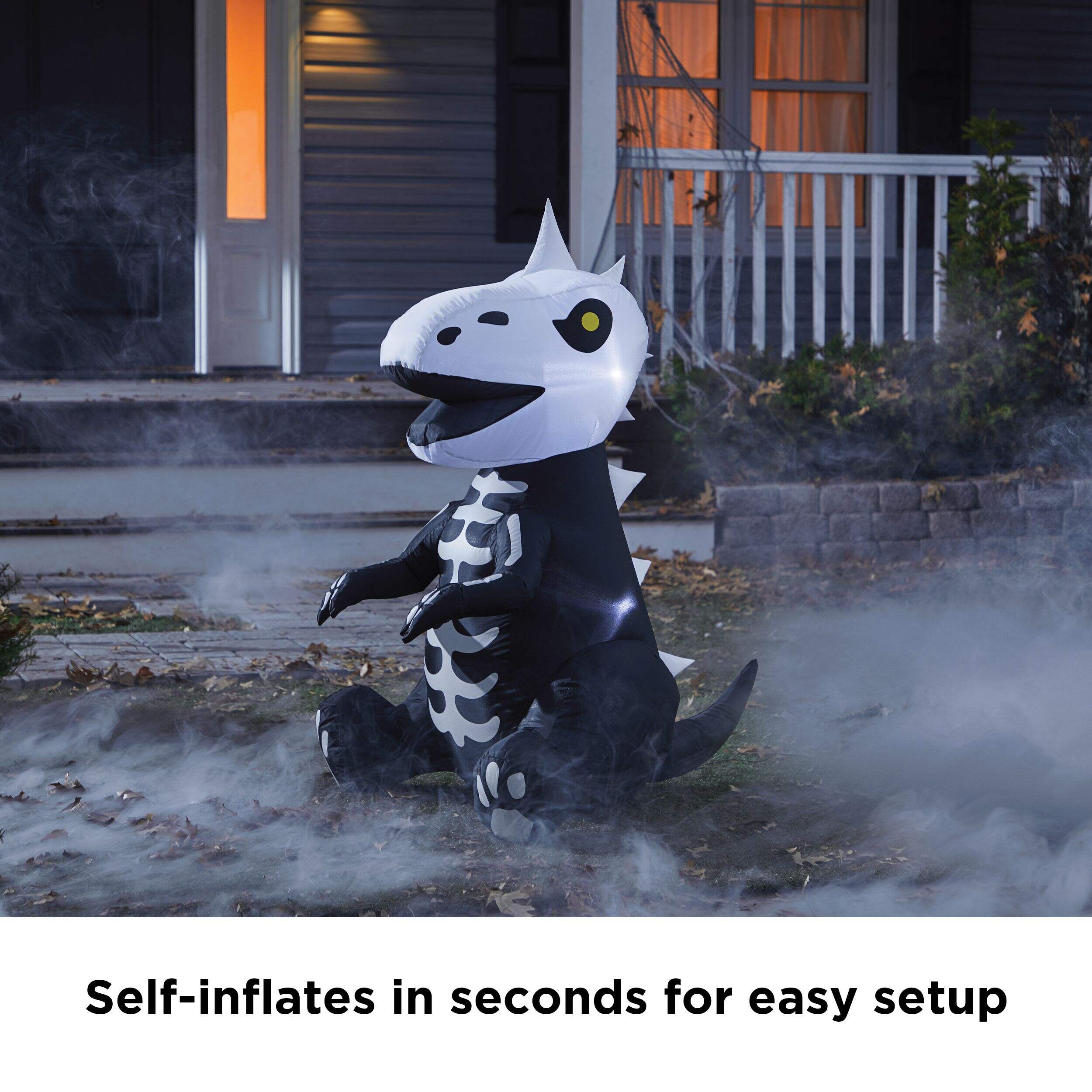The For Living Dinosaur Skeleton LED Light-Up Airblown Inflatable adds a prehistoric twist to your Halloween decorations. This black and white inflatable dino skeleton keeps it spooky while still being family friendly enough for the younger trick-or-treaters to enjoy. It self-inflates in seconds for easy set-up and features two cool white LED lights to create an ominous glow. Made from durable weather-proof fabric, this inflatable is built to last, ensuring it captivates throughout the Halloween season.