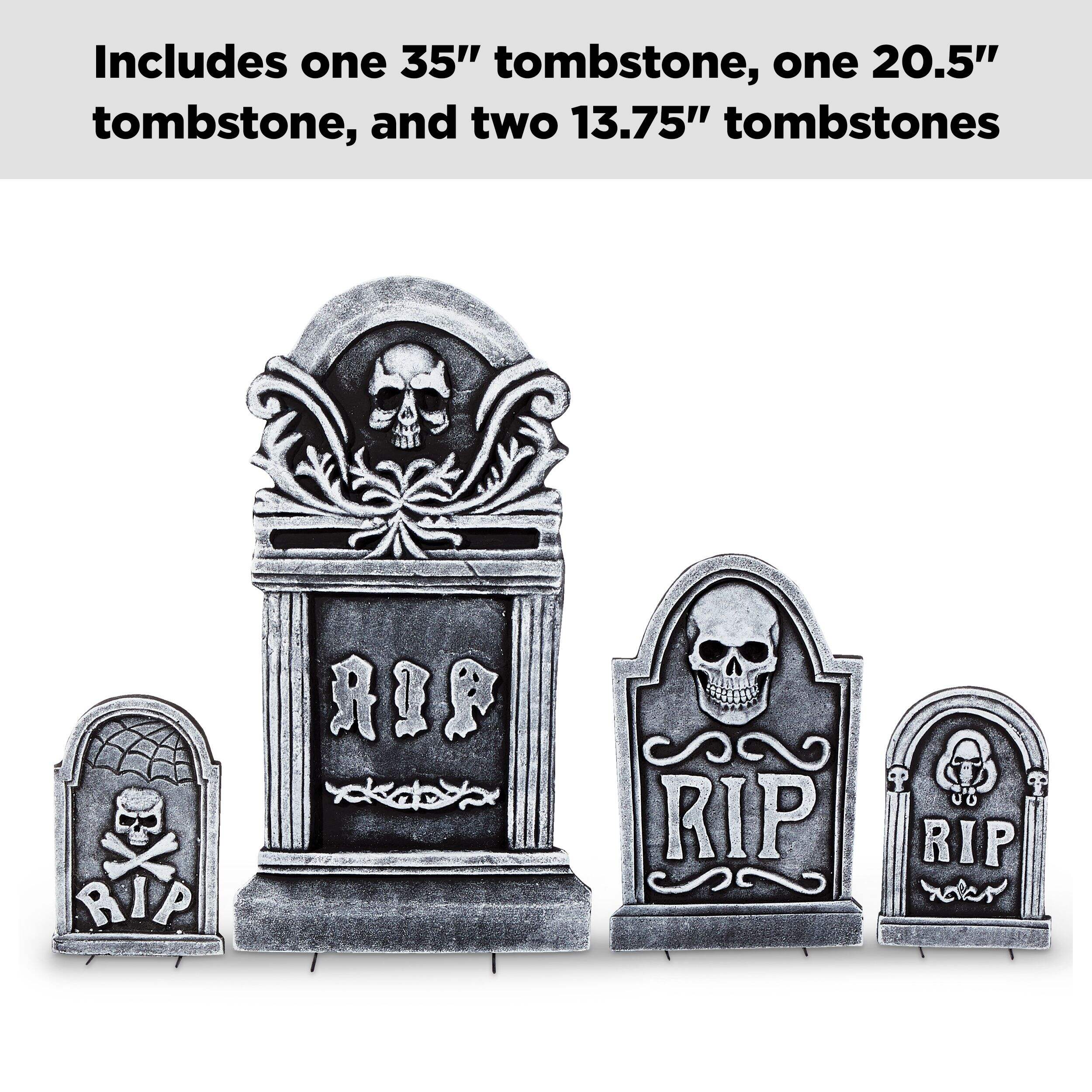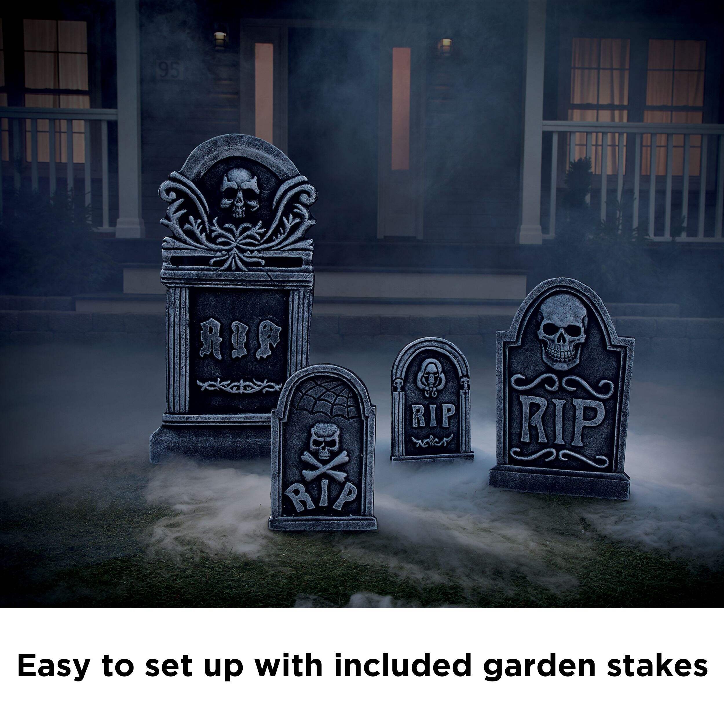 For Living "RIP" Skull Graveyard Tombstones with Stakes, Grey, 35-in, 4-pk, Outdoor Decoration for Halloween