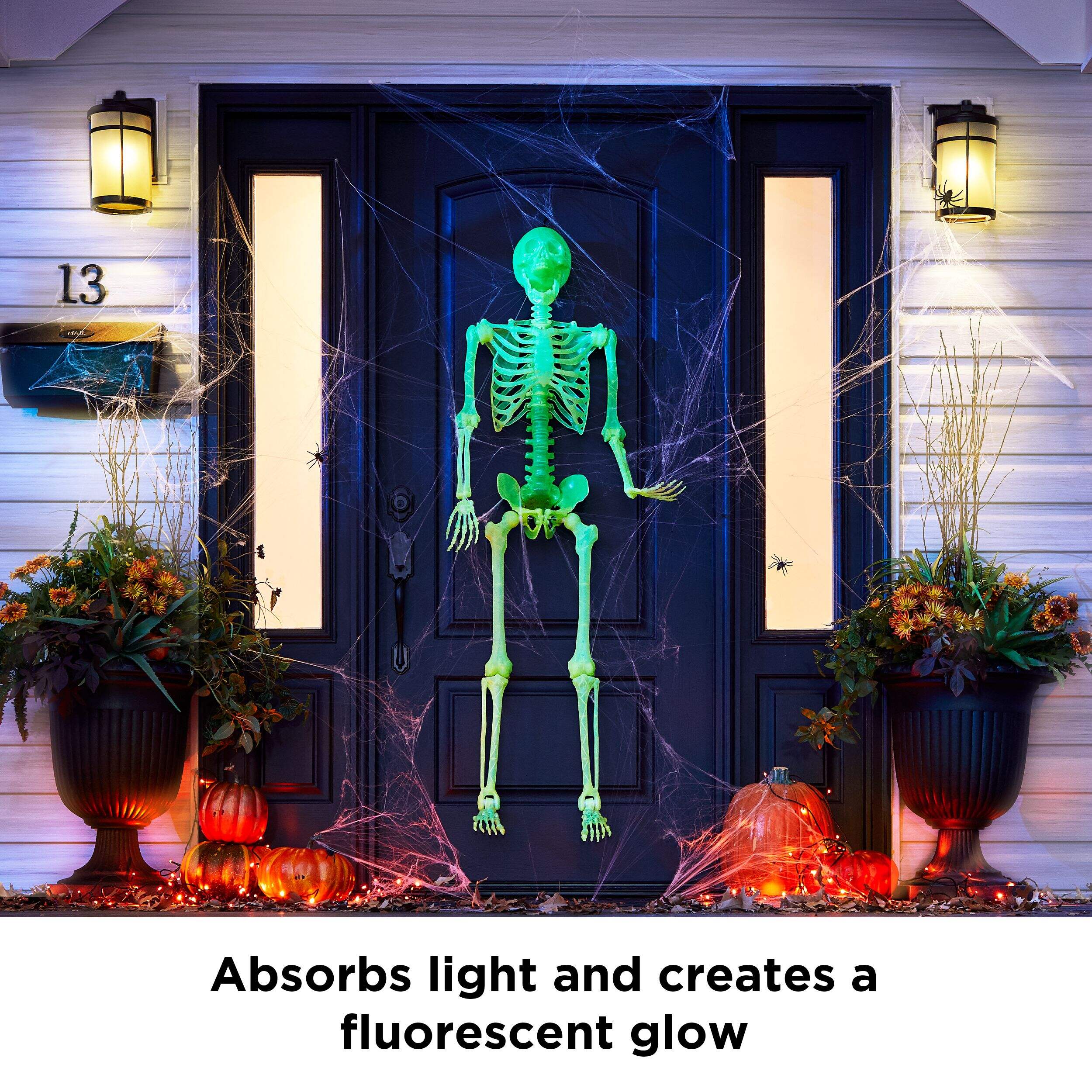 Take your Halloween decorations to the next level with the FOR LIVING Skeleton Realistic Hanging Full-Size Human Decoration. This spooky character is scary enough during the day, but after absorbing light, it gives off a ghoulish green glow that adds a frightening touch to your Halloween decorations. This hanging skeleton installs quickly and easily to spook Halloween party guests and trick-or-treaters with a frightening fluorescent effect that’s sure to be the highlight of any haunted house.