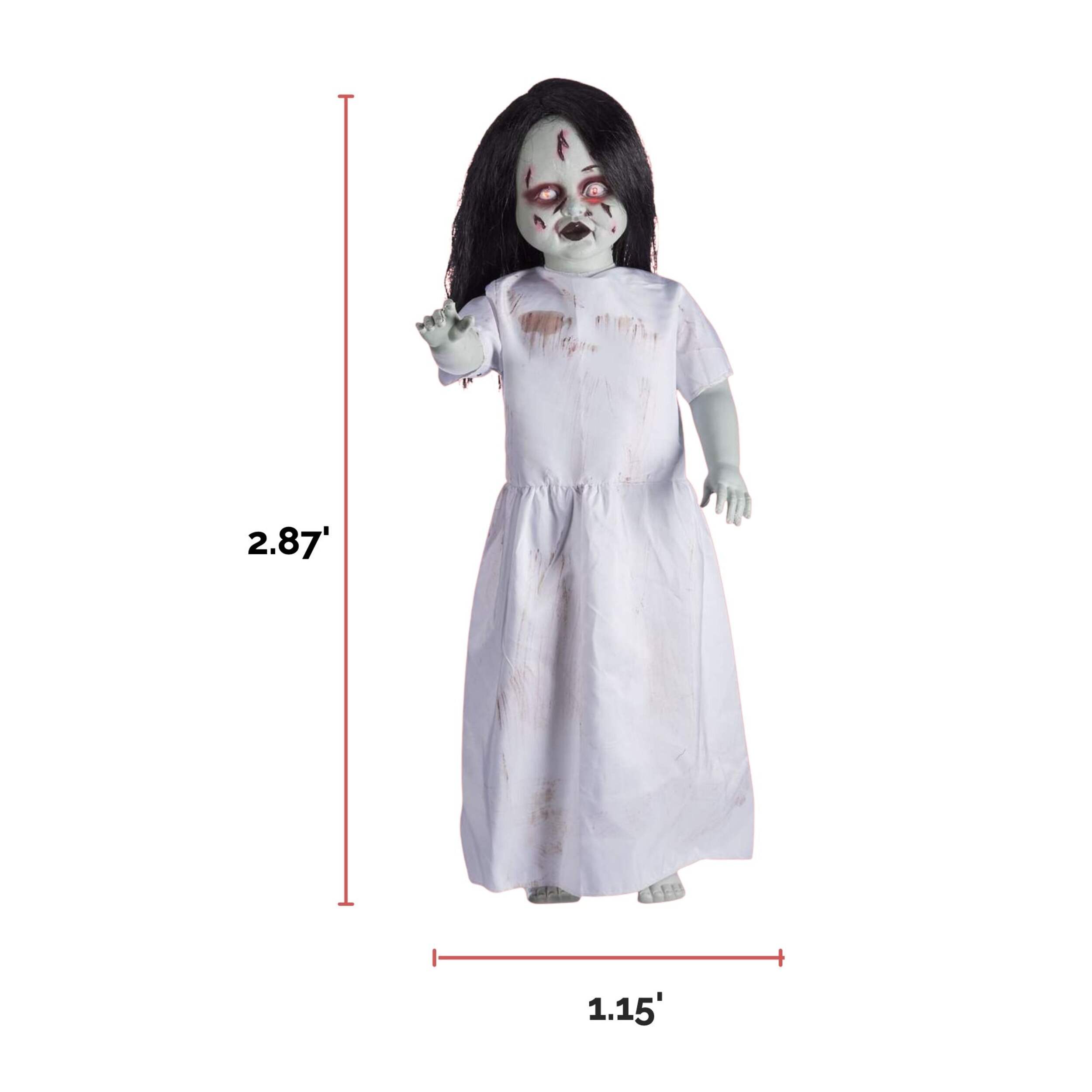 Take your Halloween display to a new level of creepiness with this For Living Animated Zombie Girl. Her lifelike, eerie appearance is sure to frighten guests and trick-or-treaters alike. She stands silently until triggered, and then her sound activating technology triggers an extra scare. This zombie’s detailed, haunting design is a fun and frightening way to upgrade your home’s holiday décor this Halloween.