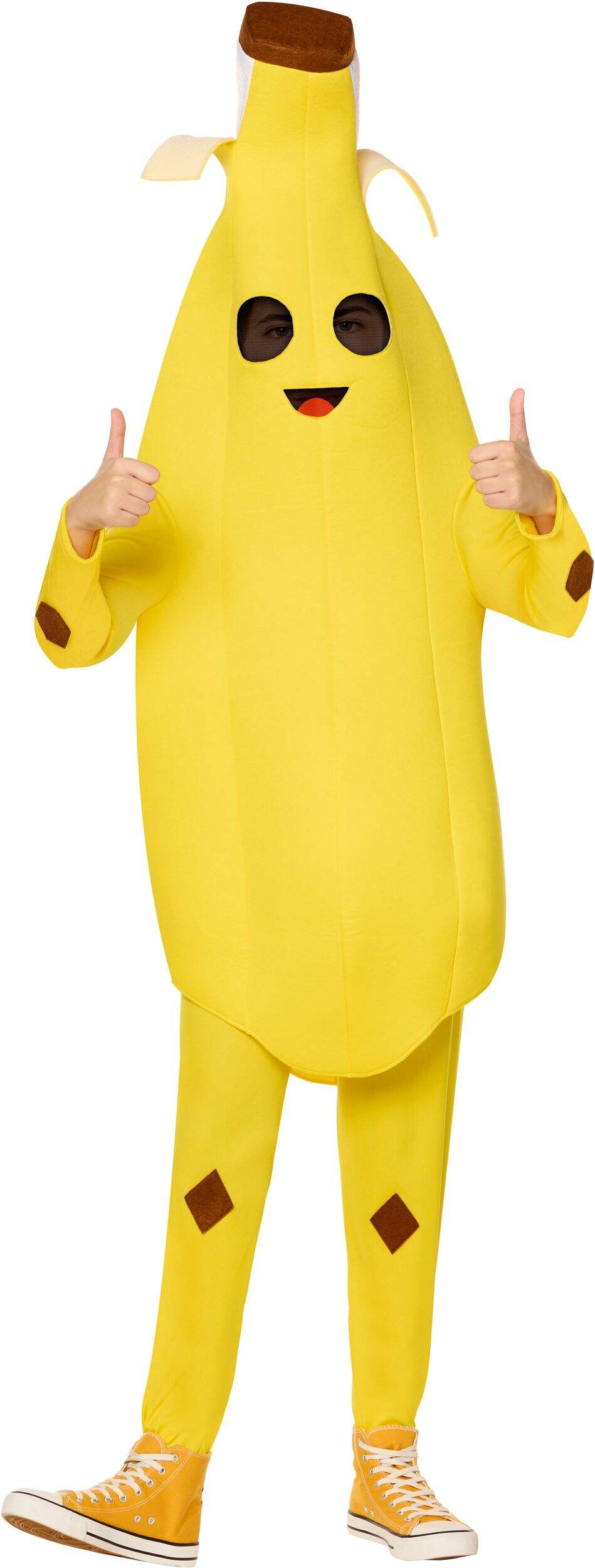 Transform into the beloved Fortnite character Peeley with this vibrant yellow jumpsuit. Perfect for Halloween or cosplay events, this costume features a cheerful banana design complete with a smiling face, ensuring you stand out at any gathering. Available in various sizes for children, it's an officially licensed Fortnite product that brings the game to life.