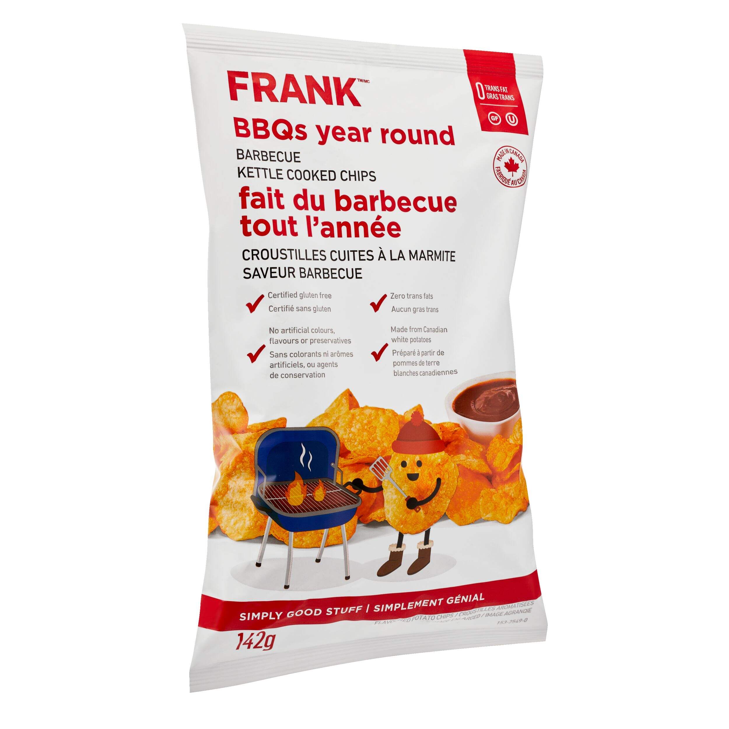 Sign up to receive a notification when this product is back in stock.The FRANK BBQ Kettle Chips, 142-g, deliver an irresistible crunchy, kettle-cooked snack made from Canadian dark russet potatoes. With every bite you'll enjoy a satisfying crunch and delicious, mouth-watering BBQ flavour from these gluten-free, no artificial colours or flavours chips. Perfect for when you crave that barbecue taste without the mess, just rip open the bag and enjoy crisp kettle cooked potato chips with a zesty BBQ twist.