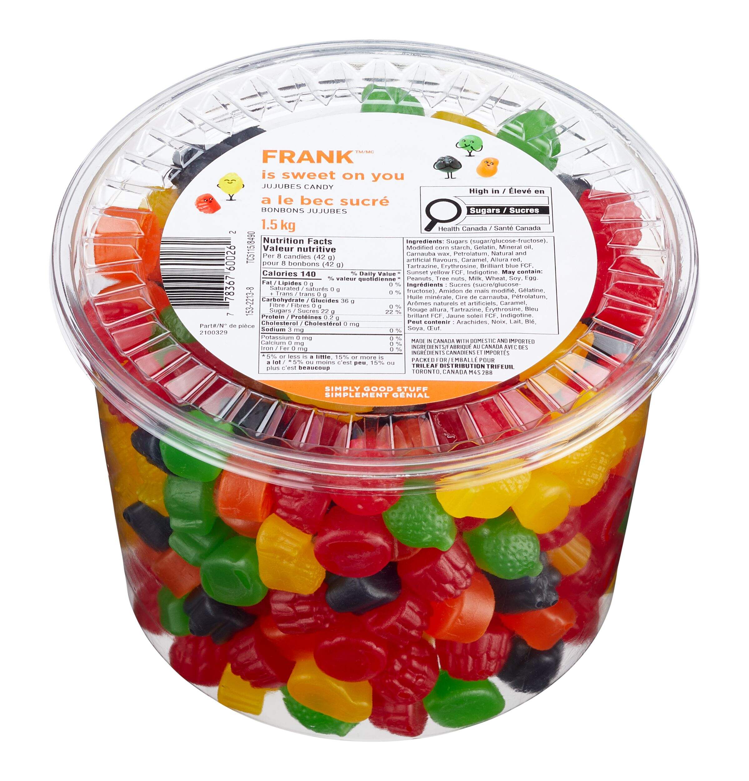 The FRANK JuJubes Candy Tub contains a sweet assortment of juicy fruit flavours. This tub contains an array of soft, chewy jujubes in assorted flavours. Always check product labels for accurate ingredient and allergen information before enjoying these nostalgic fruit-flavoured jujubes.