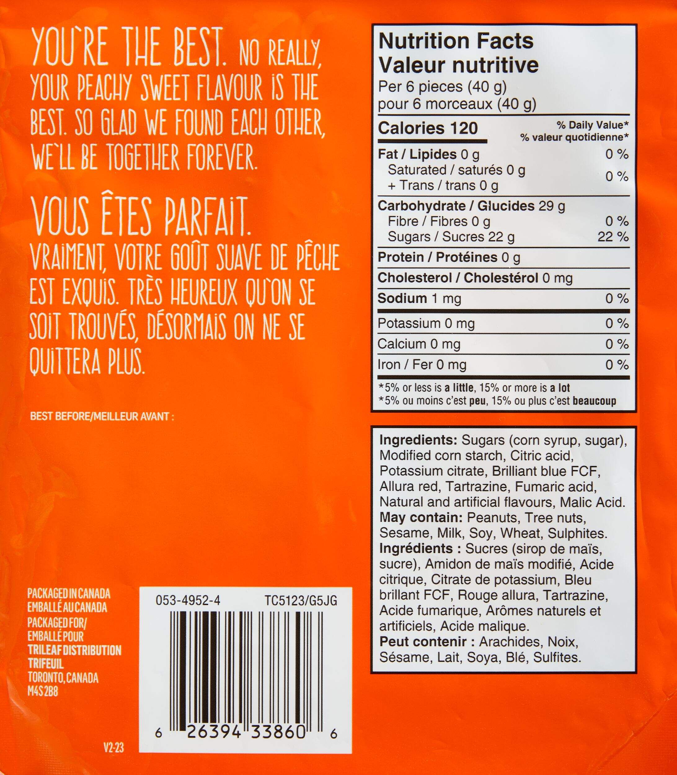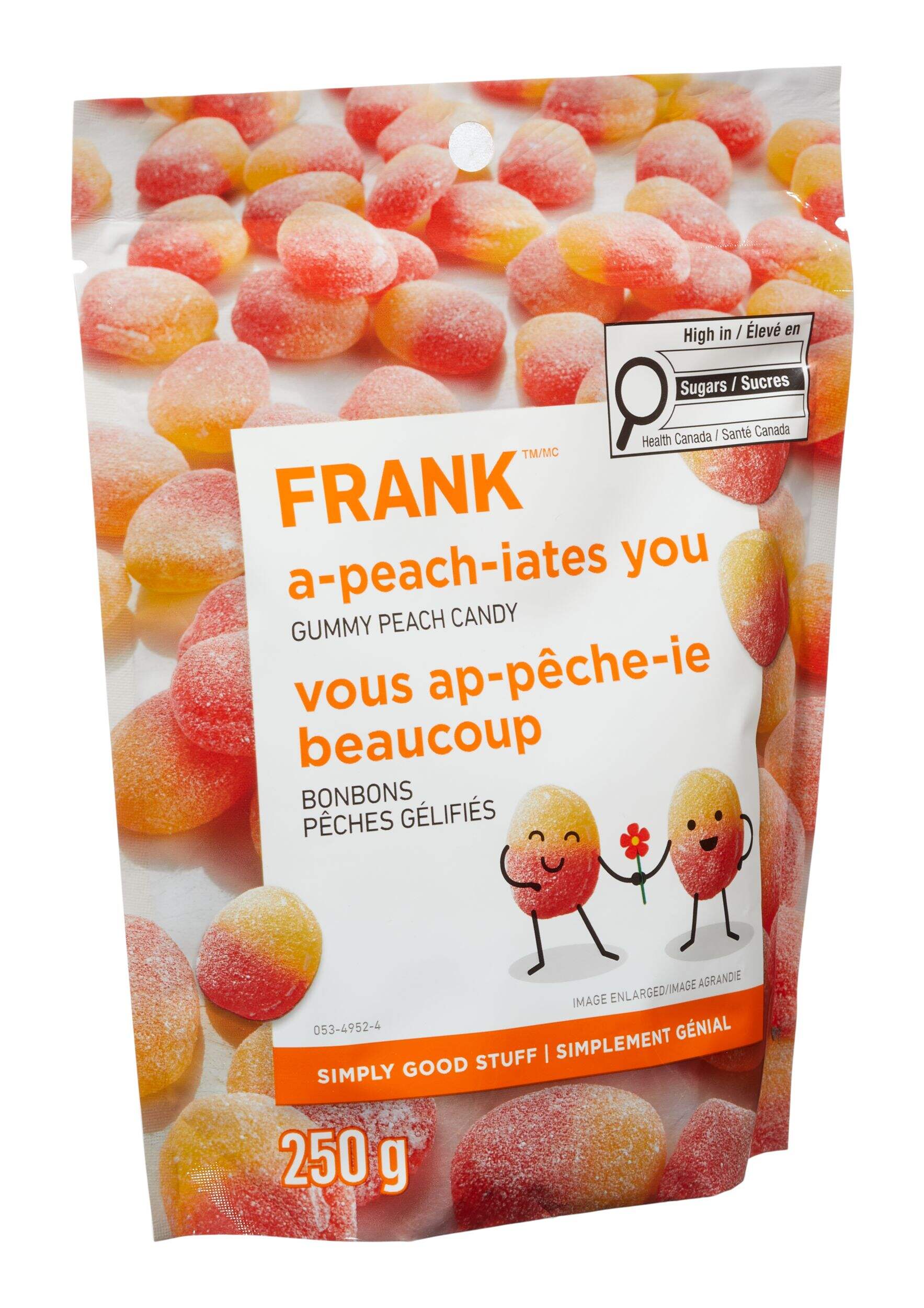 The FRANK Peach Gummy Candy pack offers 250 grams of chewy, peach-flavored treats perfect for sharing with friends. These soft, juicy gummies capture the sweet taste of ripe peaches in a bite-sized candy. Packed in a resealable bag, they make an ideal snack to take to parties, school, work, or enjoy at home. With a delicious peach flavor, these gummy candies from FRANK provide a tasty way to satisfy your sweet tooth.