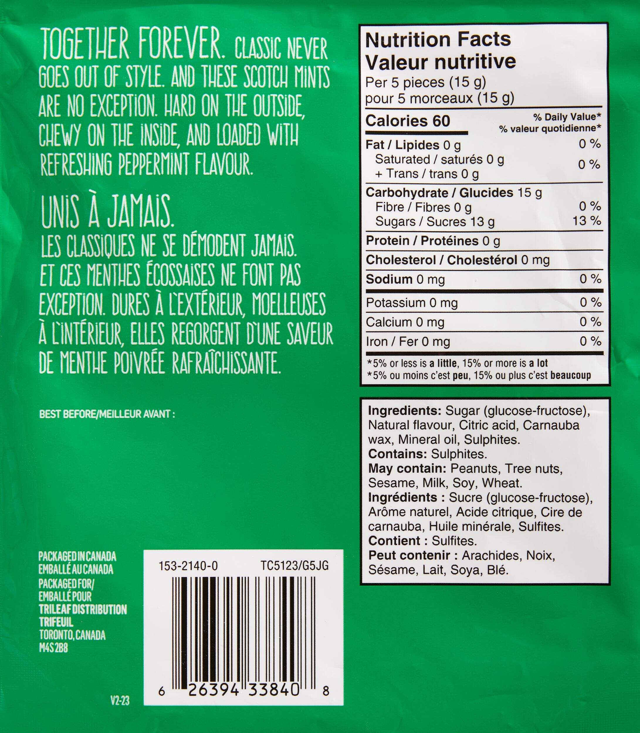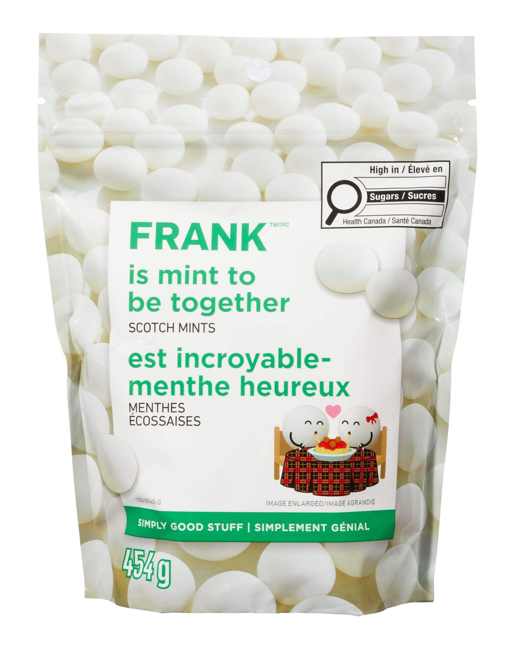 The FRANK Scotch Mints, 454-g, is a classic chewy mint candy treat. This refreshing 454g tin pack contains the distinctive crispy, buttery flavour of Scotch mints. The generously sized pieces deliver a cool, minty taste that lingers. These mints make an ideal after-dinner mint or anytime snack. Their crunchy texture and smooth creamy finish will satisfy cravings. Tuck a tin in your purse or keep one handy on your desk for a mouthwatering hit of flavour.