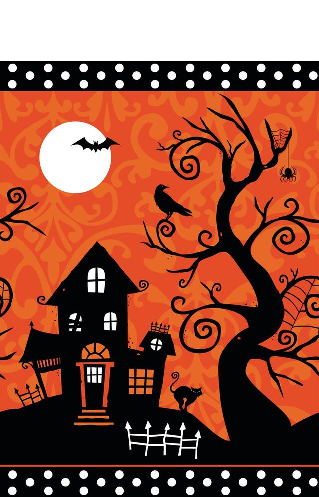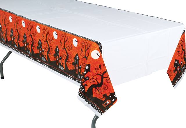 • Create a spooky ambience with the Frightfully Fancy Plastic Table Cover that features shadowy frightful images