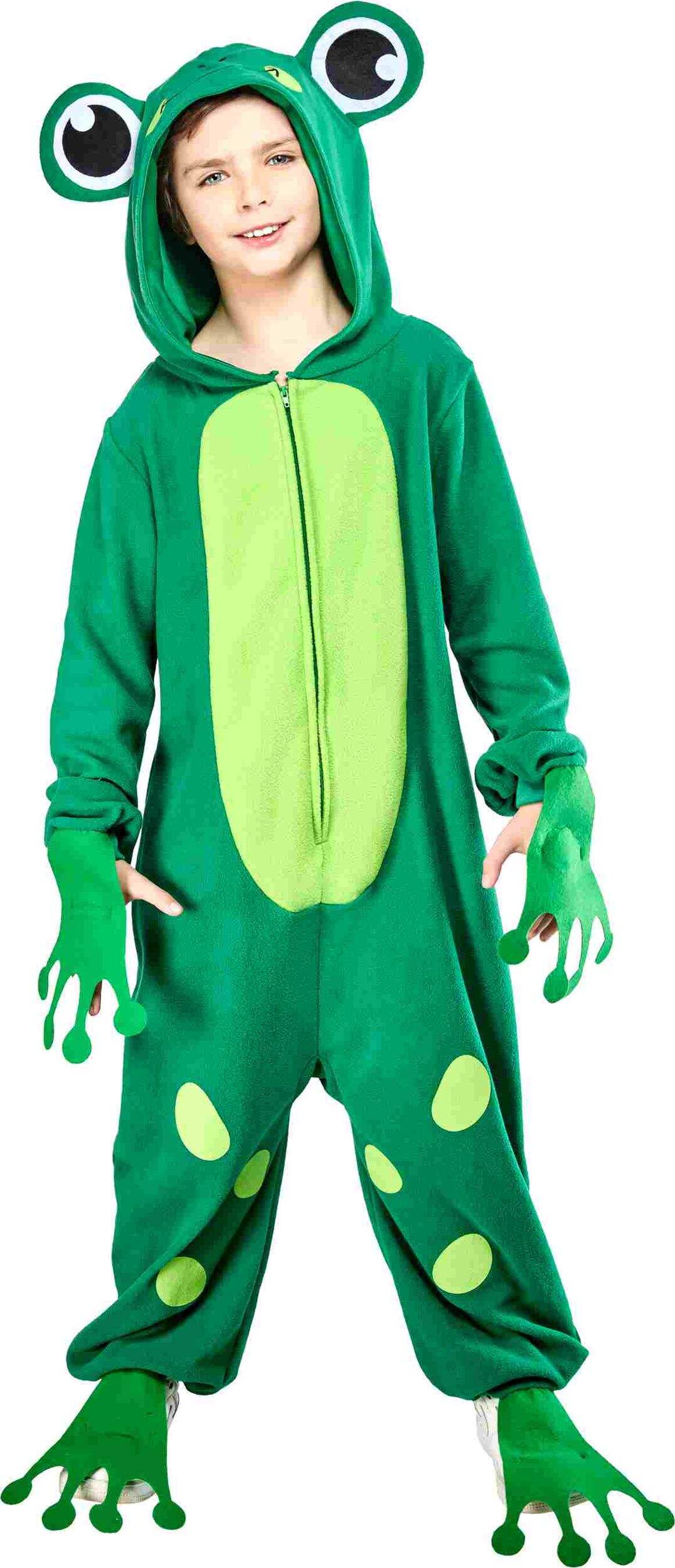 This costume features a hooded green onesie with frog eyes, a lighter green belly patch, and webbed mittens attached to the sleeves