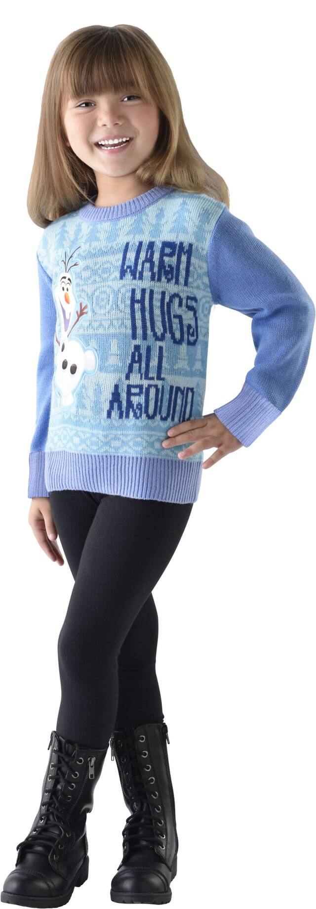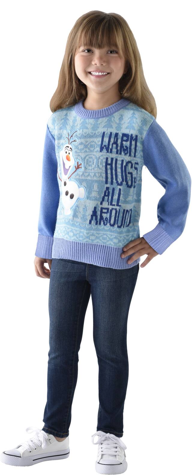 Blue knit sweater features contrast trimming and an Olaf applique on the front next to the headline "Warm Hugs All Around"