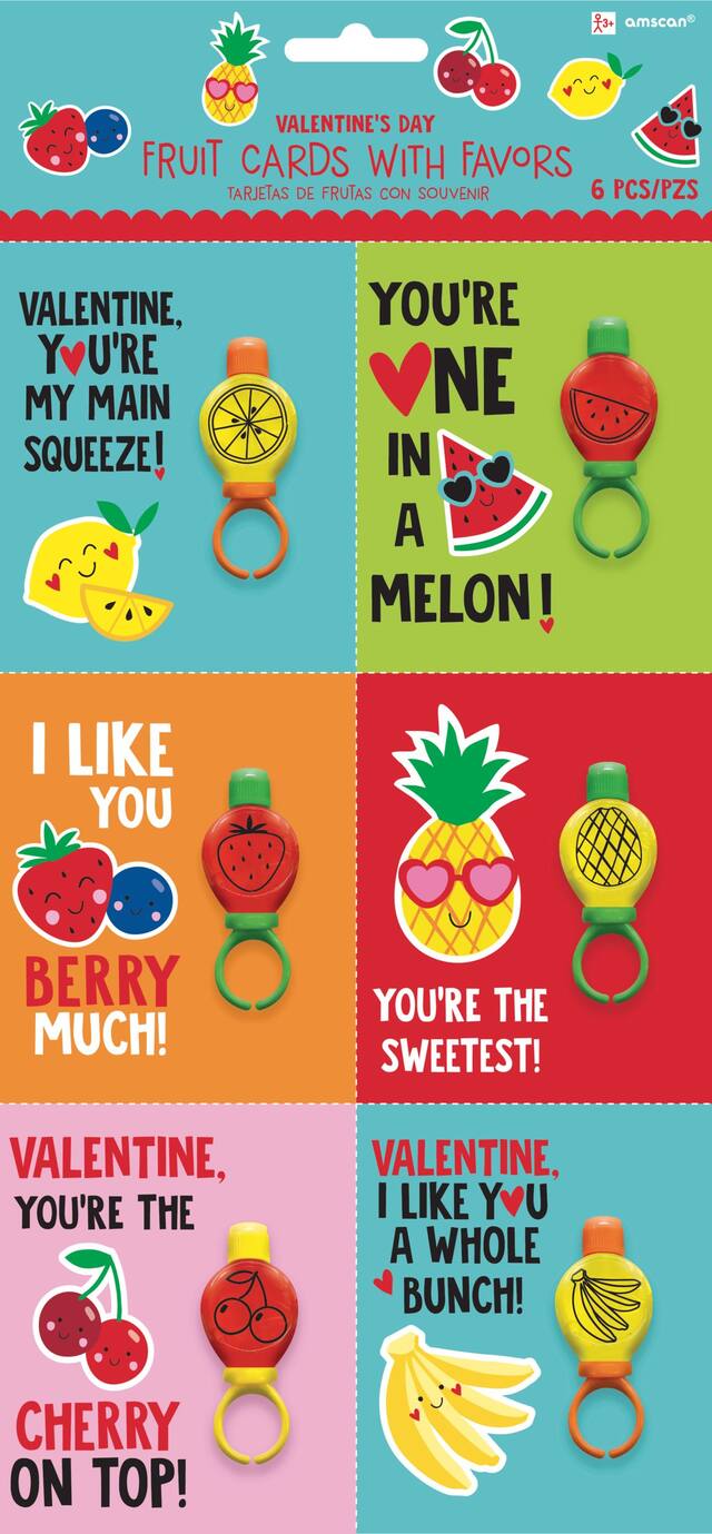 You may be interested in these similar products shown below.Fruit Valentine Exchange Cards with Favours features fruit-themed bubble rings and messages such as "I Like You Berry Much!" and "You're One in a Melon!"