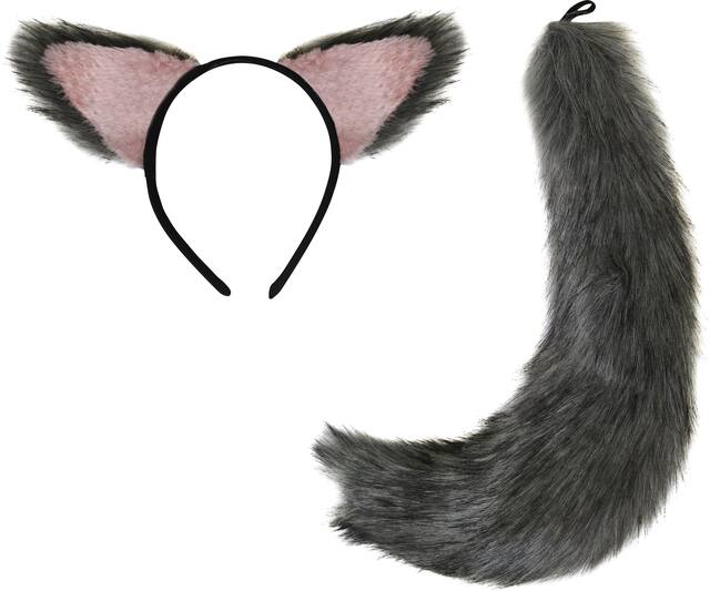 Kit consists of a fuzzy grey headband with wolf ears at the top and an oversized tail with an elastic loop