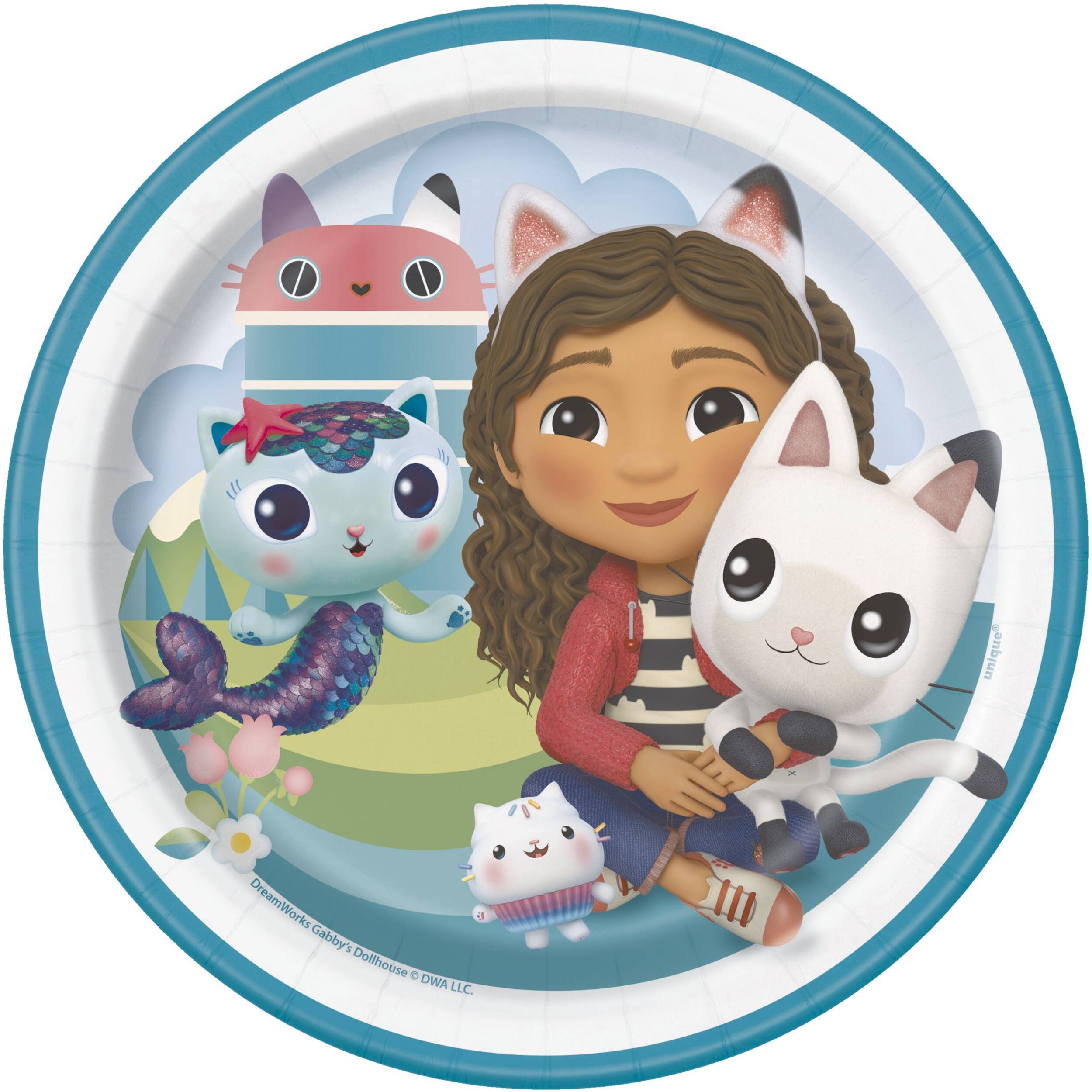 Make your child's birthday party extra special with Gabby's Dollhouse Round Paper Dessert Plates. These vibrant blue plates feature adorable cat designs, adding a fun touch to any celebration. Perfect for serving desserts, they ensure a delightful dining experience for young guests.