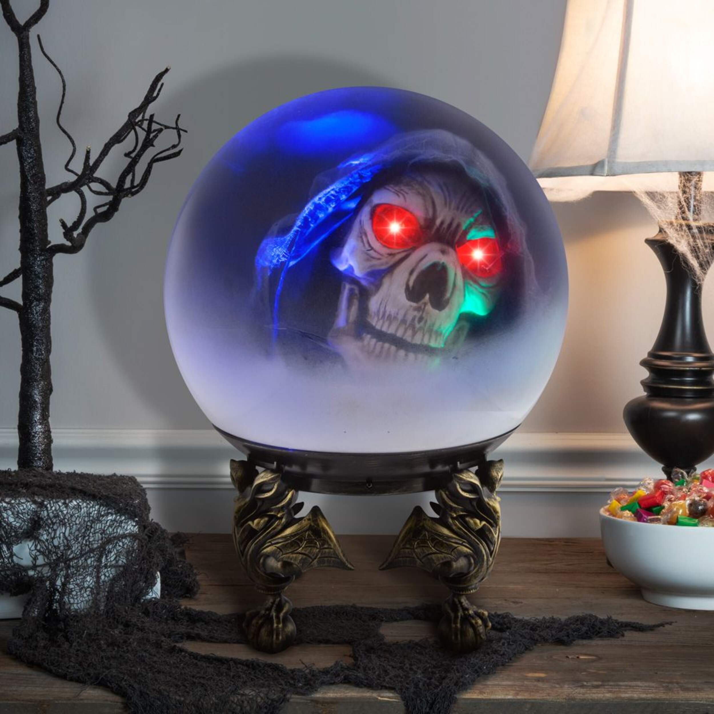 Crystal ball features a frosted bottom with LED lights, an animated skull and glowing eyes