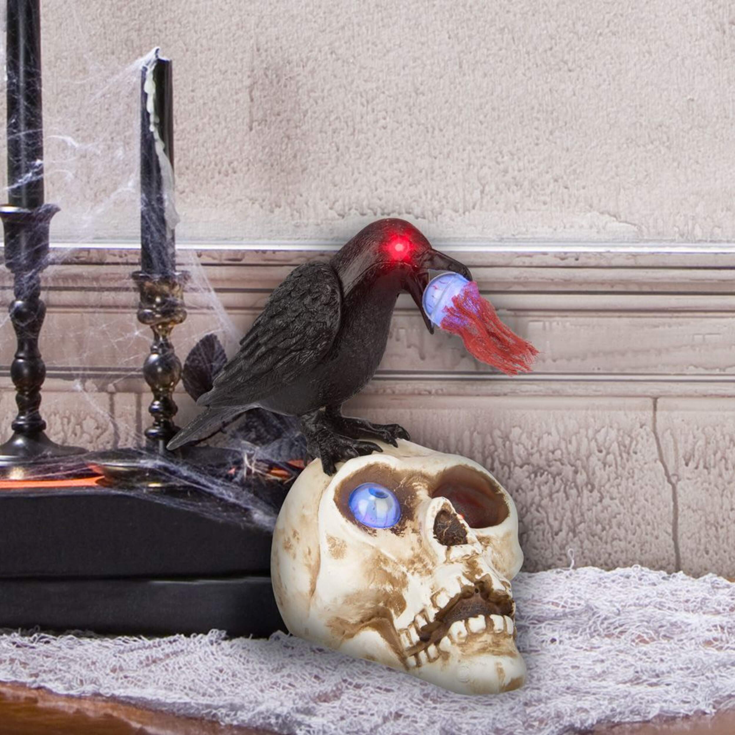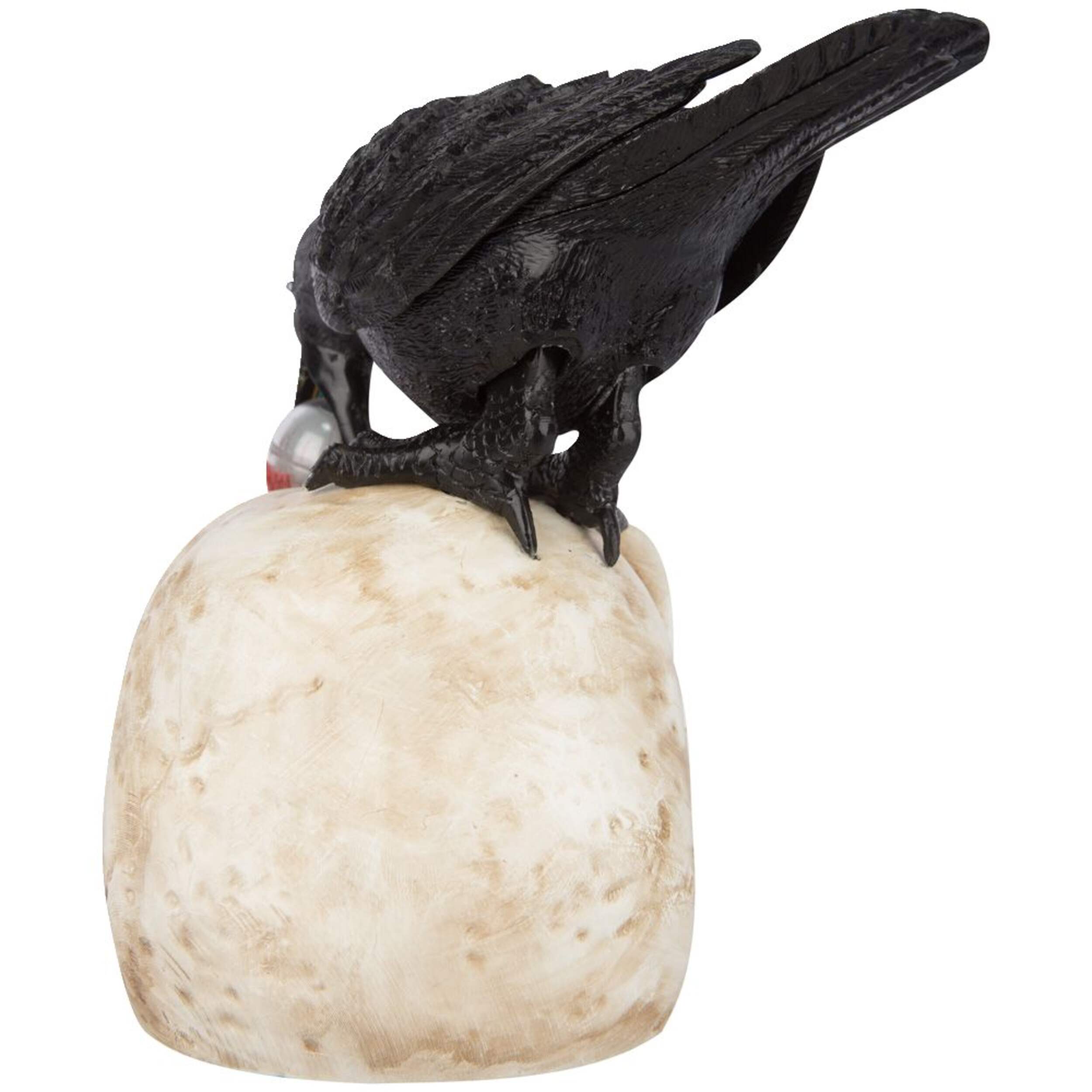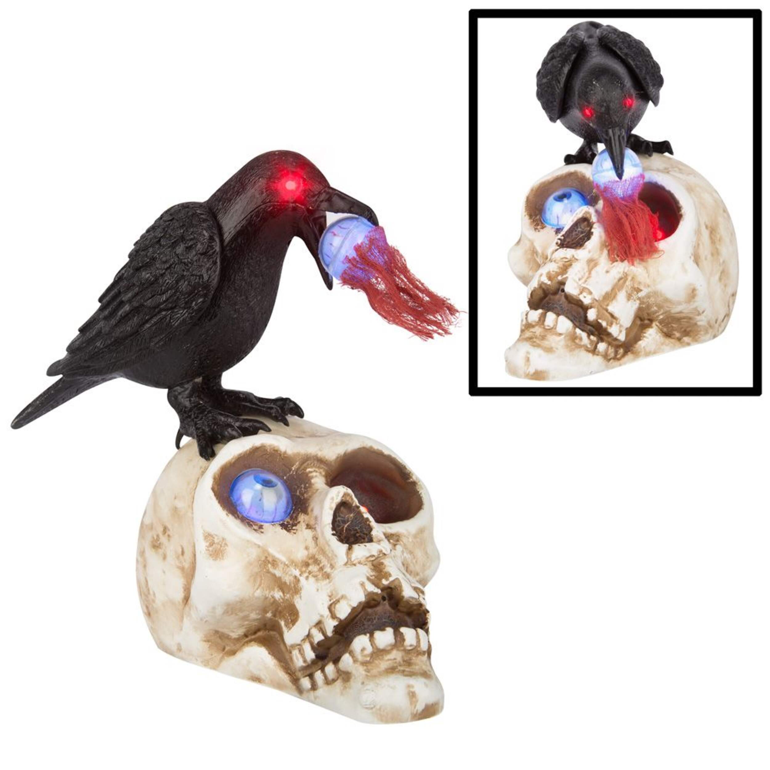 This animated tabletop skull has a crow pecking at its eyeball which brightly lights up red and purple