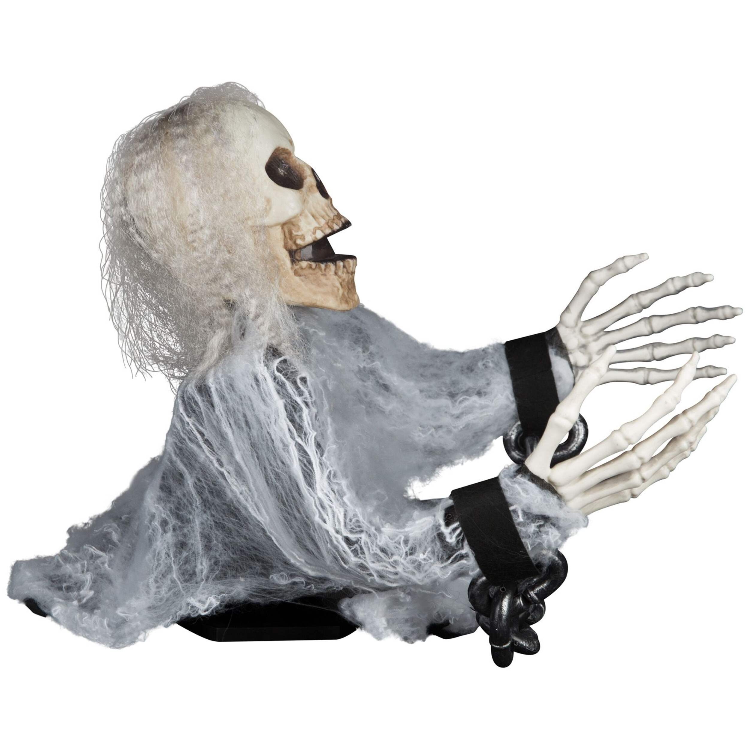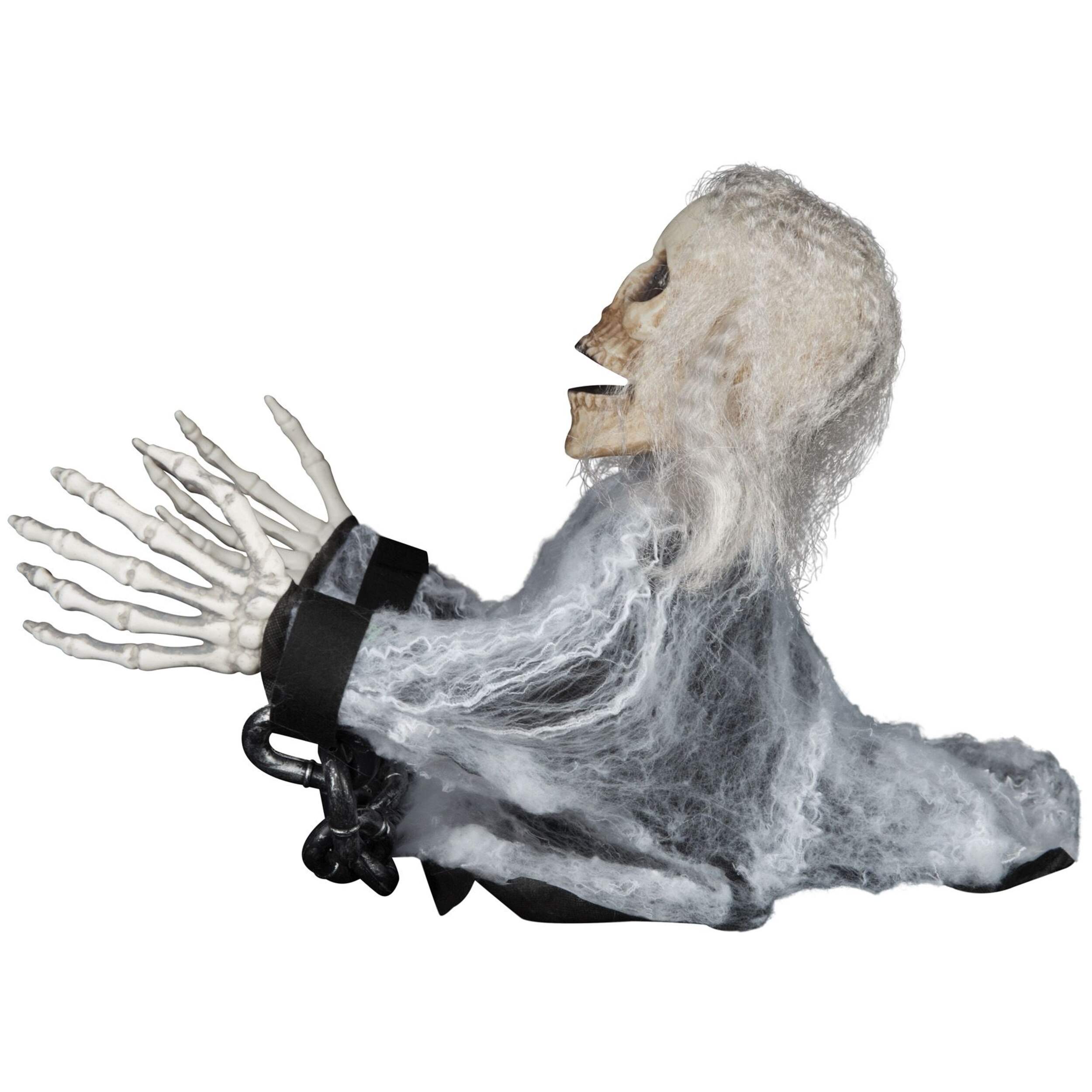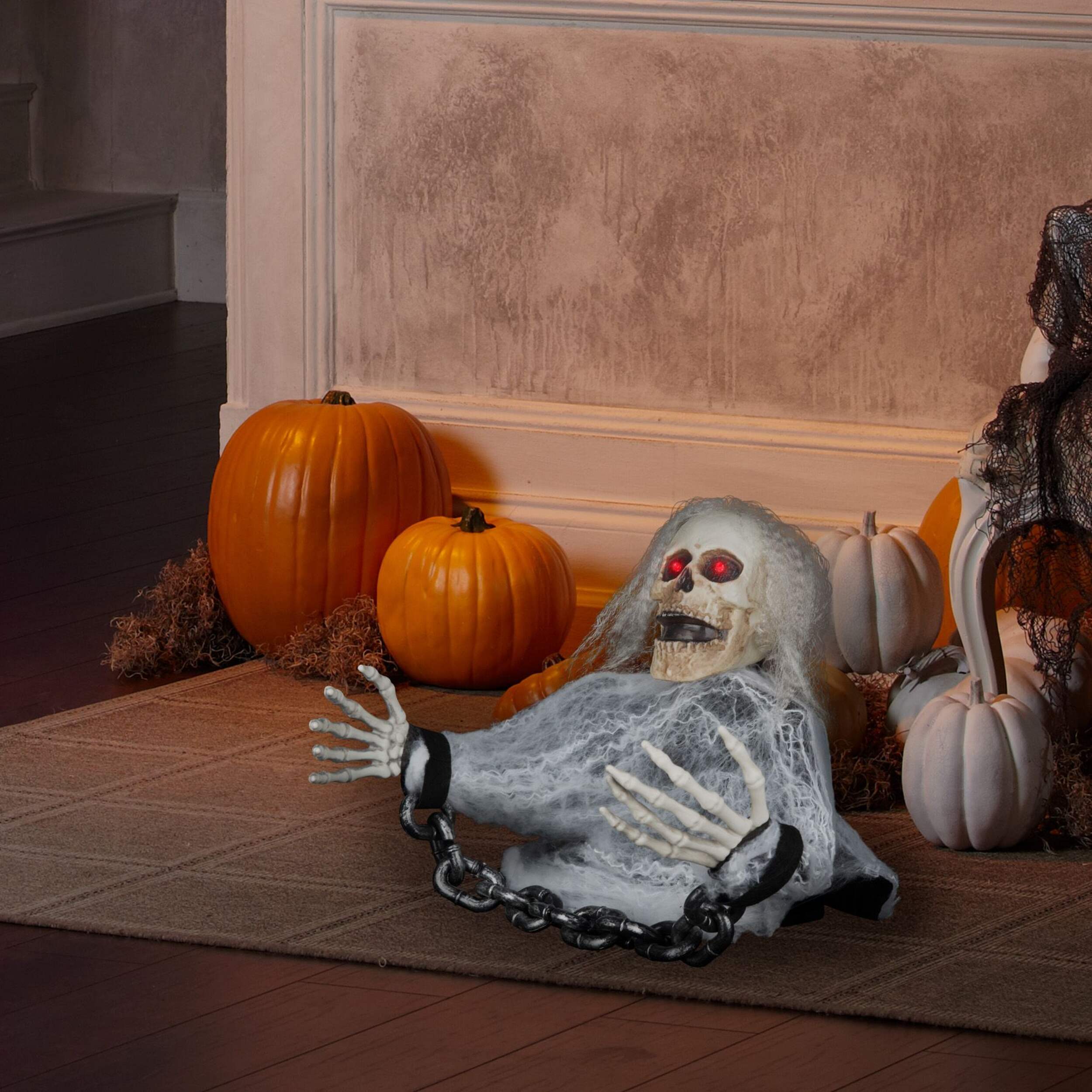 Make Halloween truly spooky with the Gemmy Grim Reaper Skeleton Animated LED Light-Up Crawler Prop with Batteries. This 19" tall animated skeleton prop features a poseable body and chains that twist and jerk to eerie background music and cackling. His eyes light up an ominous red when activated by the touch sensor. Powered by AA batteries, this indoor/outdoor decoration for Halloween is easy to set up wherever you want spine-tingling action. With its motion, sound and lighting, this Grim Reaper prop creates a scary animated display that makes Halloween frighteningly fun.
