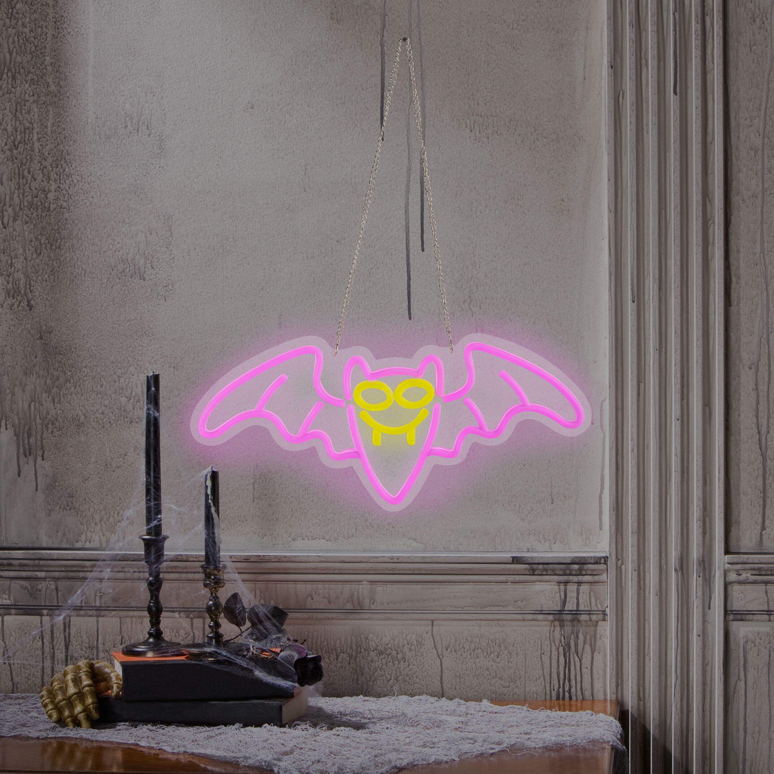 Brighten up your Halloween decorations with the Gemmy Indoor/Outdoor Neon Halloween Sign featuring a friendly bat design. This vibrant sign, with its purple and yellow hues, adds a festive touch to any space, making it perfect for both indoor and outdoor settings. Create a spooky yet welcoming atmosphere for your Halloween celebrations.