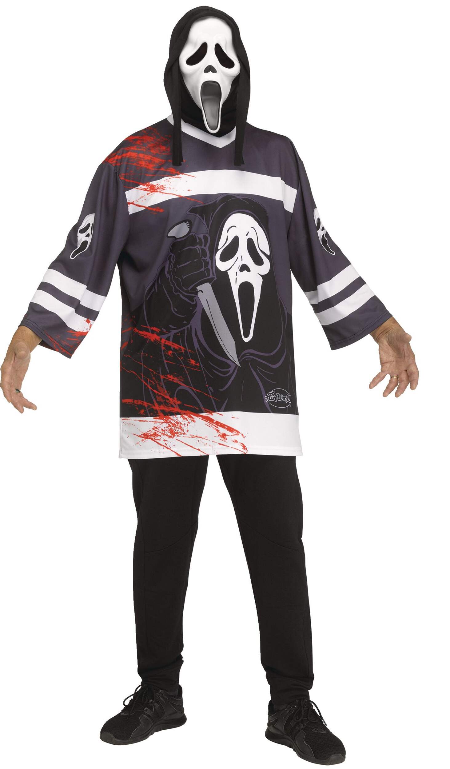 Ghost Face® Scream Hockey Jersey Halloween Costume includes a jersey spattered with blood and an image of ghost face holding a knife, black and white colour scheme and the ghost face mask