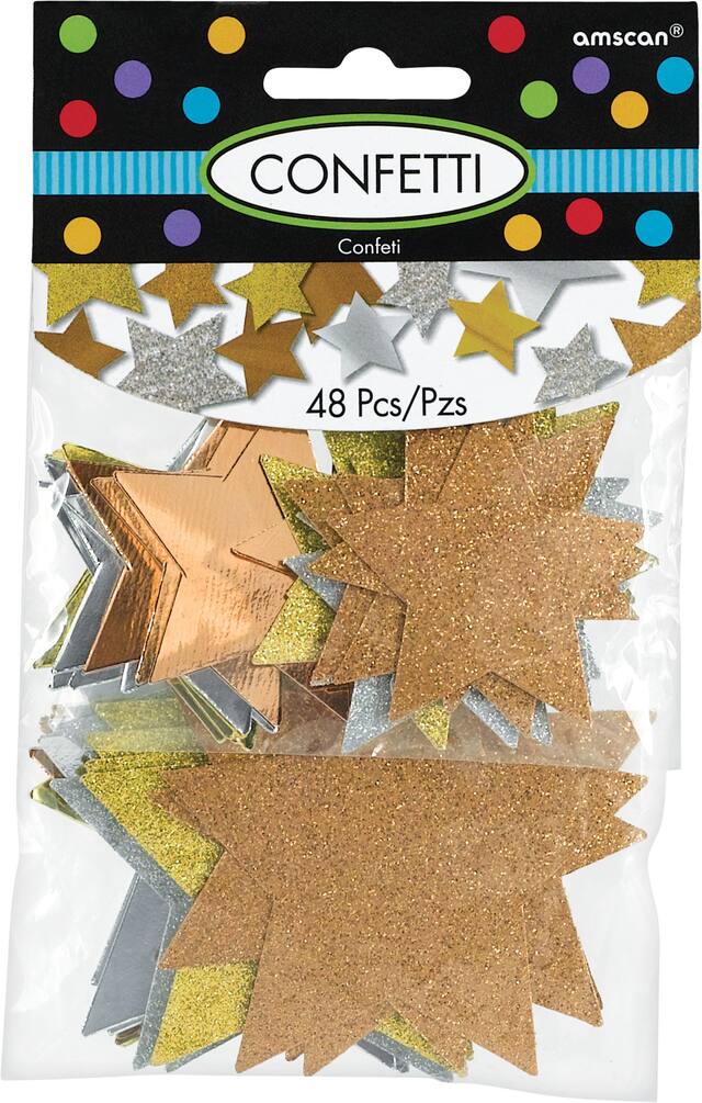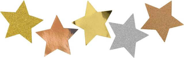 Cardstock confetti stars come in two different sizes and feature copper, gold, and silver designs