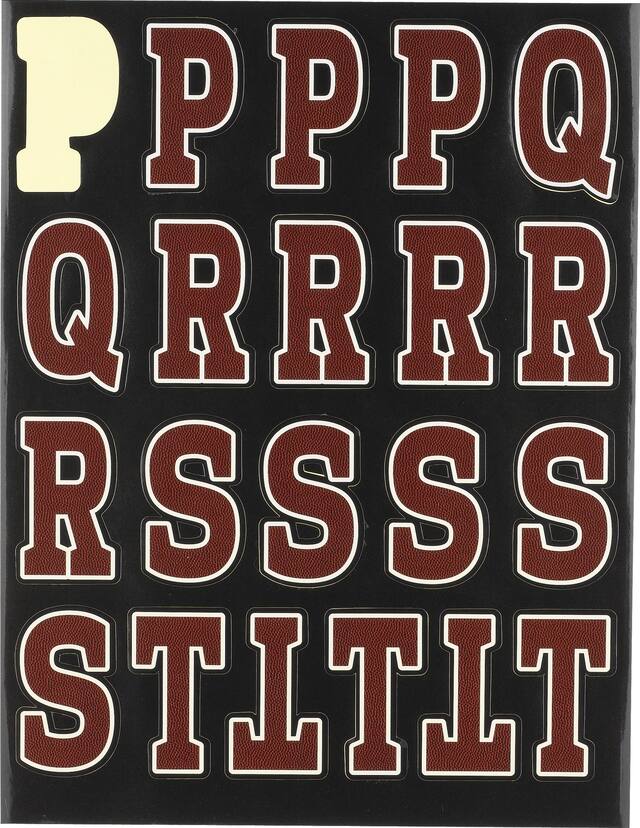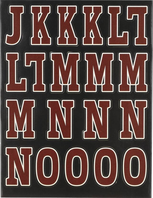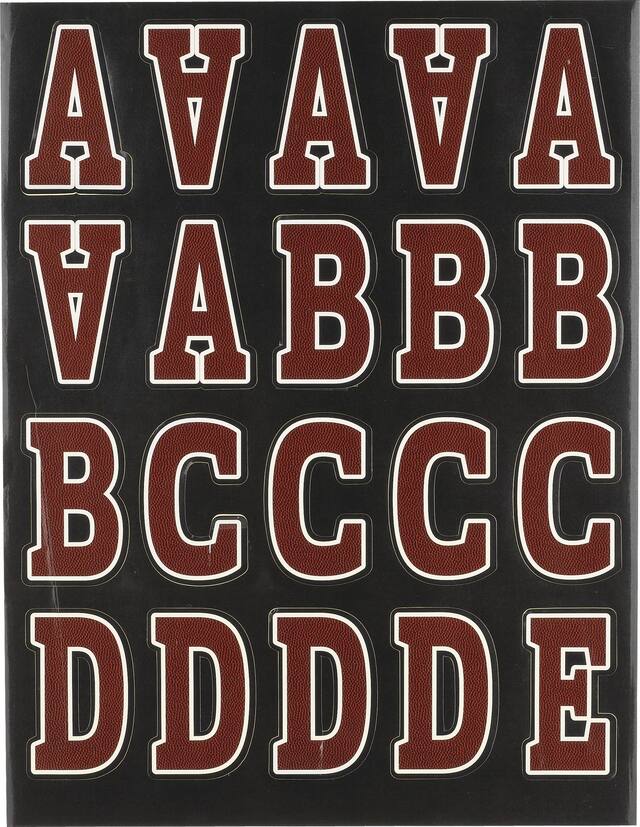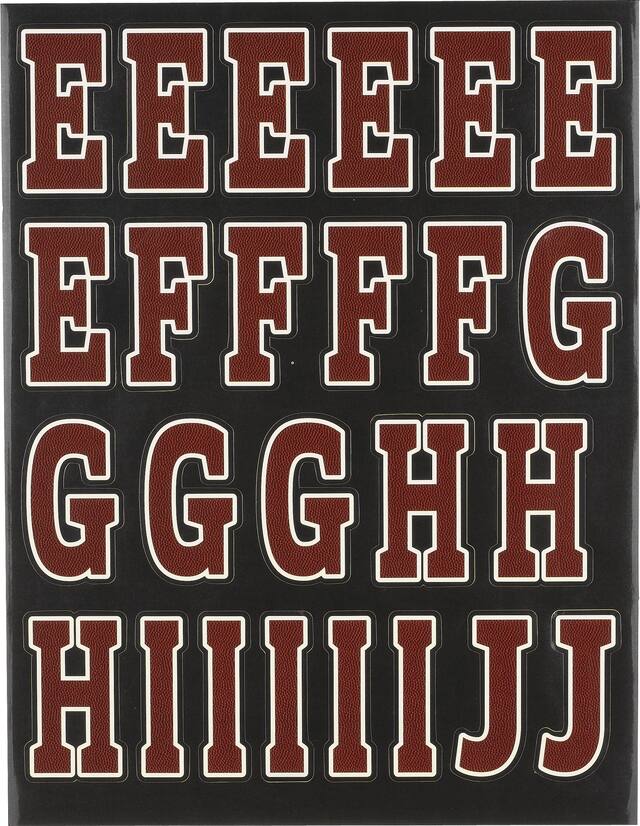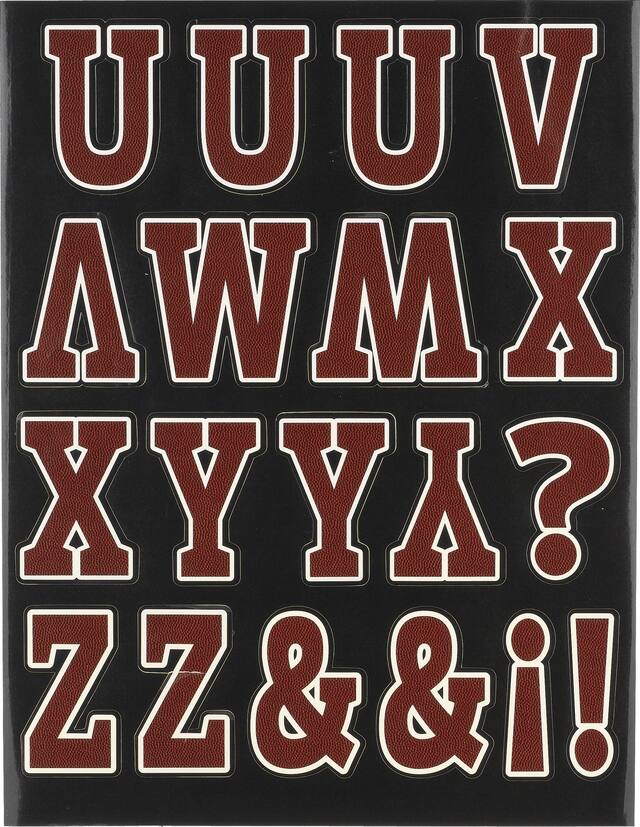 Included is a set of pigskin-print letter and number stickers for creating a custom sign
