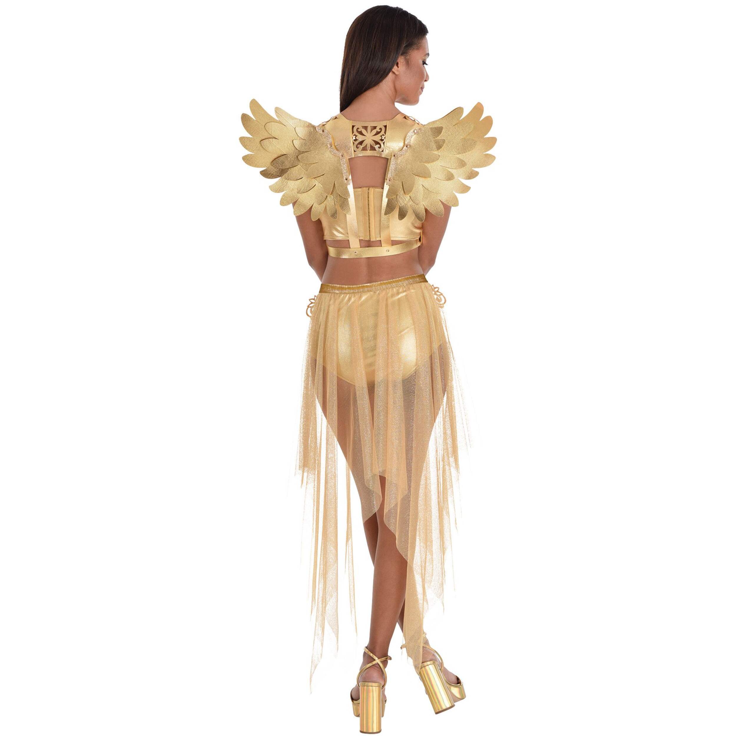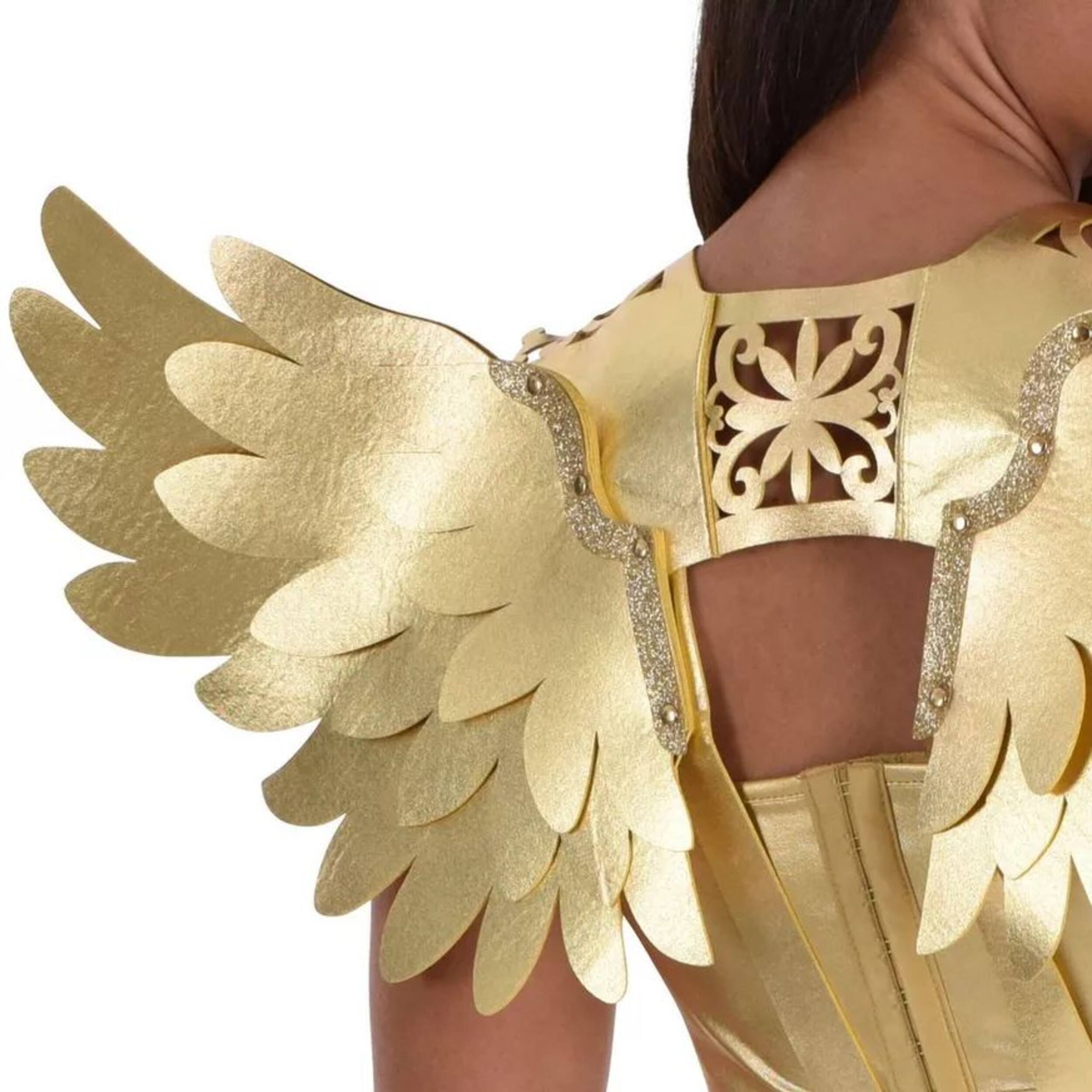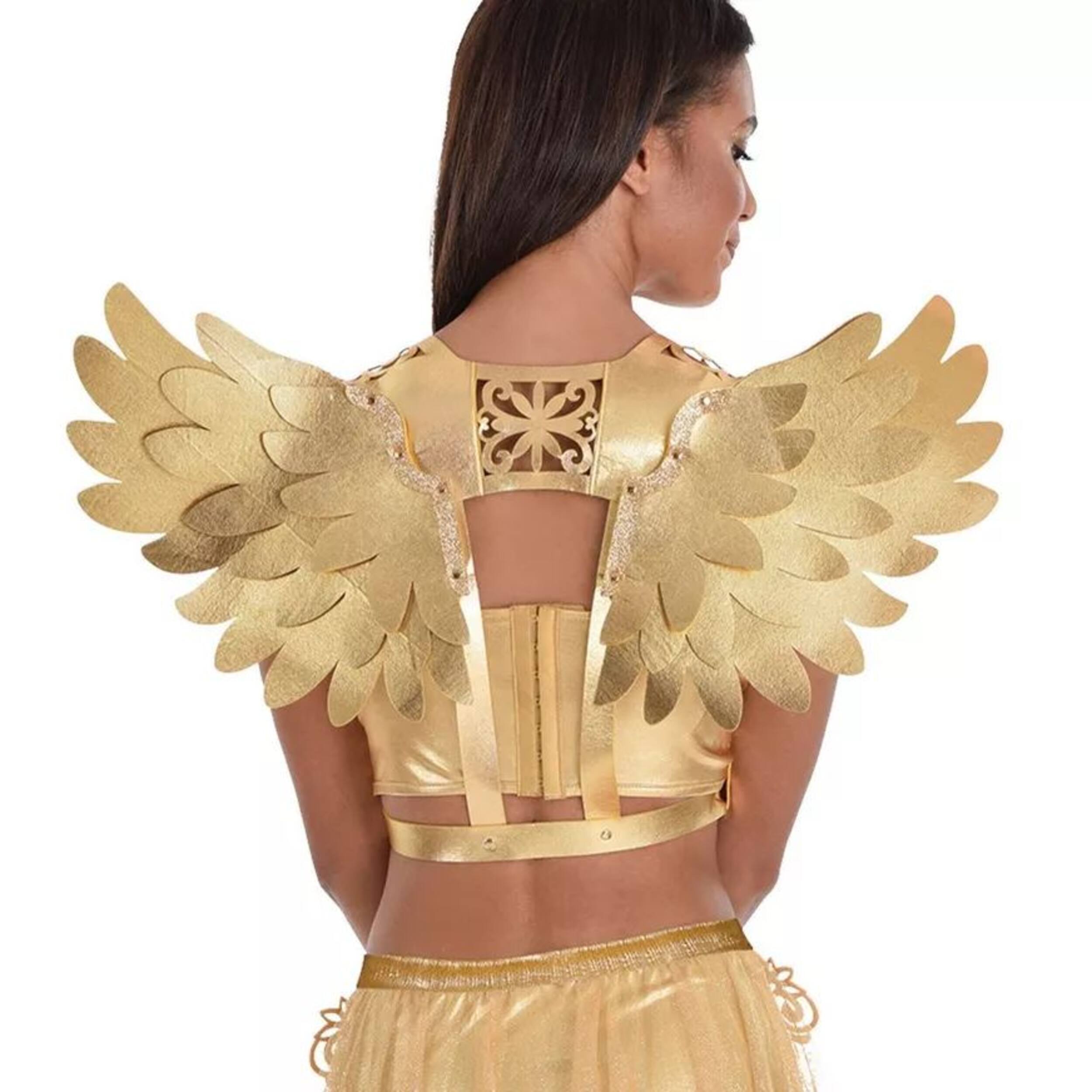 Elevate your costume game with the Gilded Glam Wing Harness. These stunning gold wings are perfect for adding a touch of elegance and fantasy to any outfit. Ideal for both adults and teens, this costume accessory ensures a comfortable fit for most wearers.