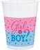 You may be interested in these similar products shown below.Girl or Boy Gender Reveal Plastic Cups feature a blue and pink wraparound print of "Girl or Boy?" headlines