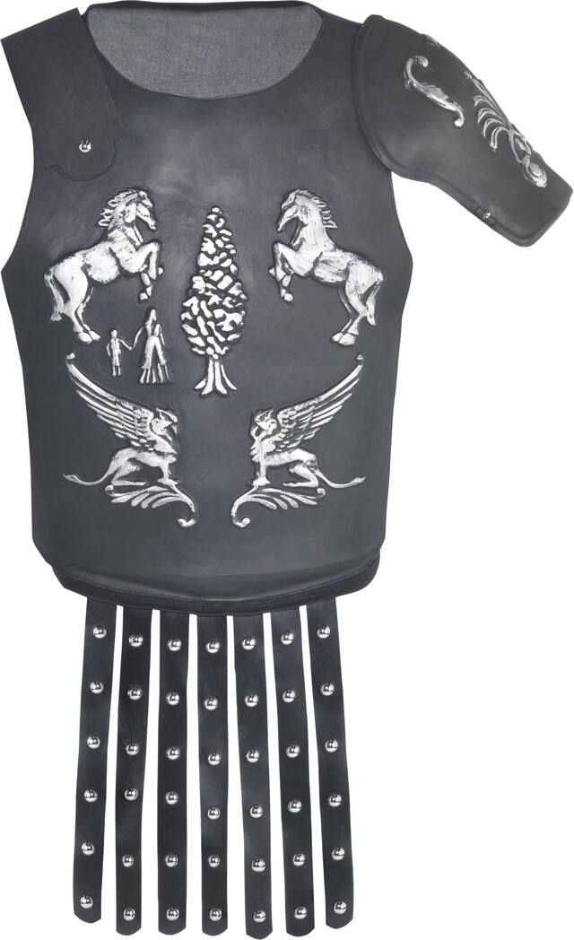 Includes a cuirass with attached shoulder armor two black gauntlets and a gray glove all inspired by the Gladiator movie