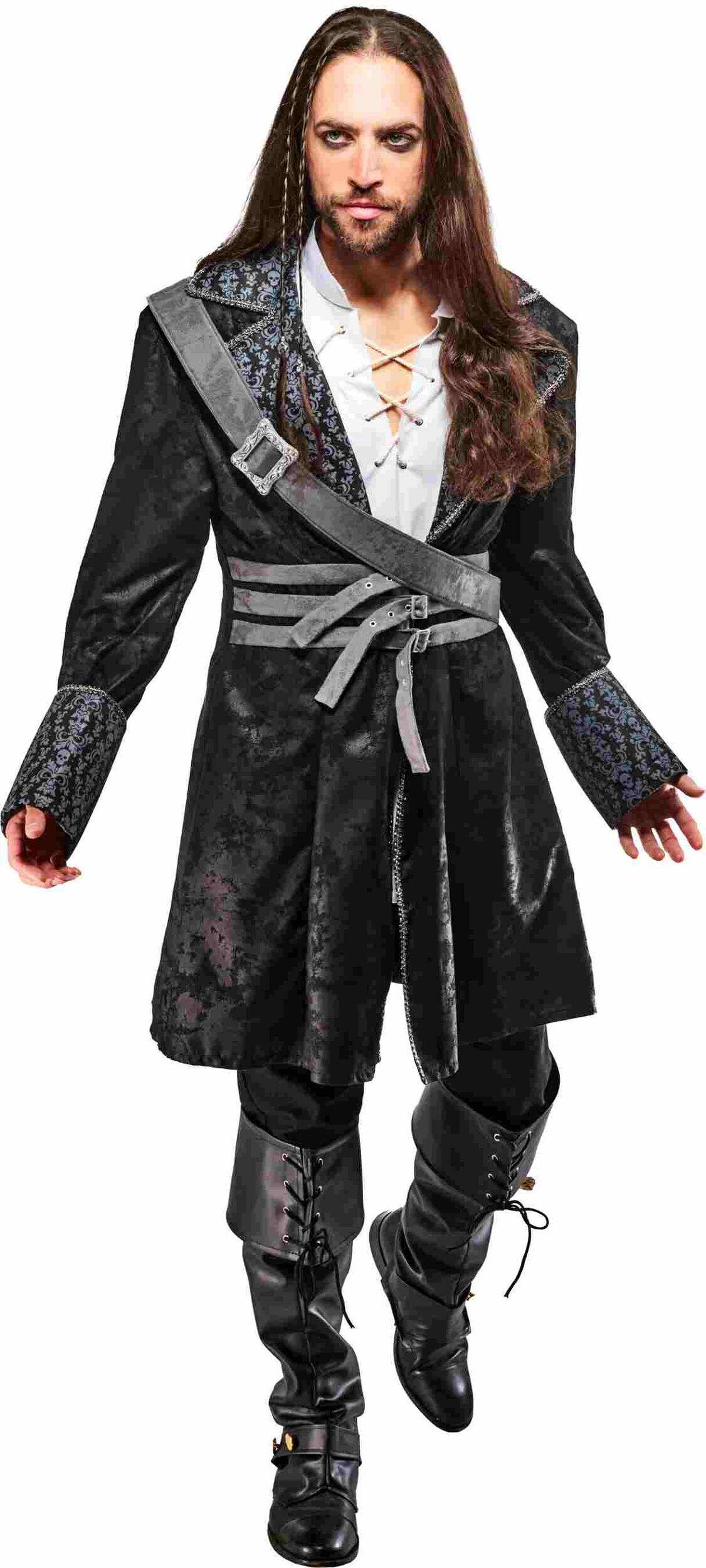 Black pirate jacket features a sash belt and 3 small belts around the waist