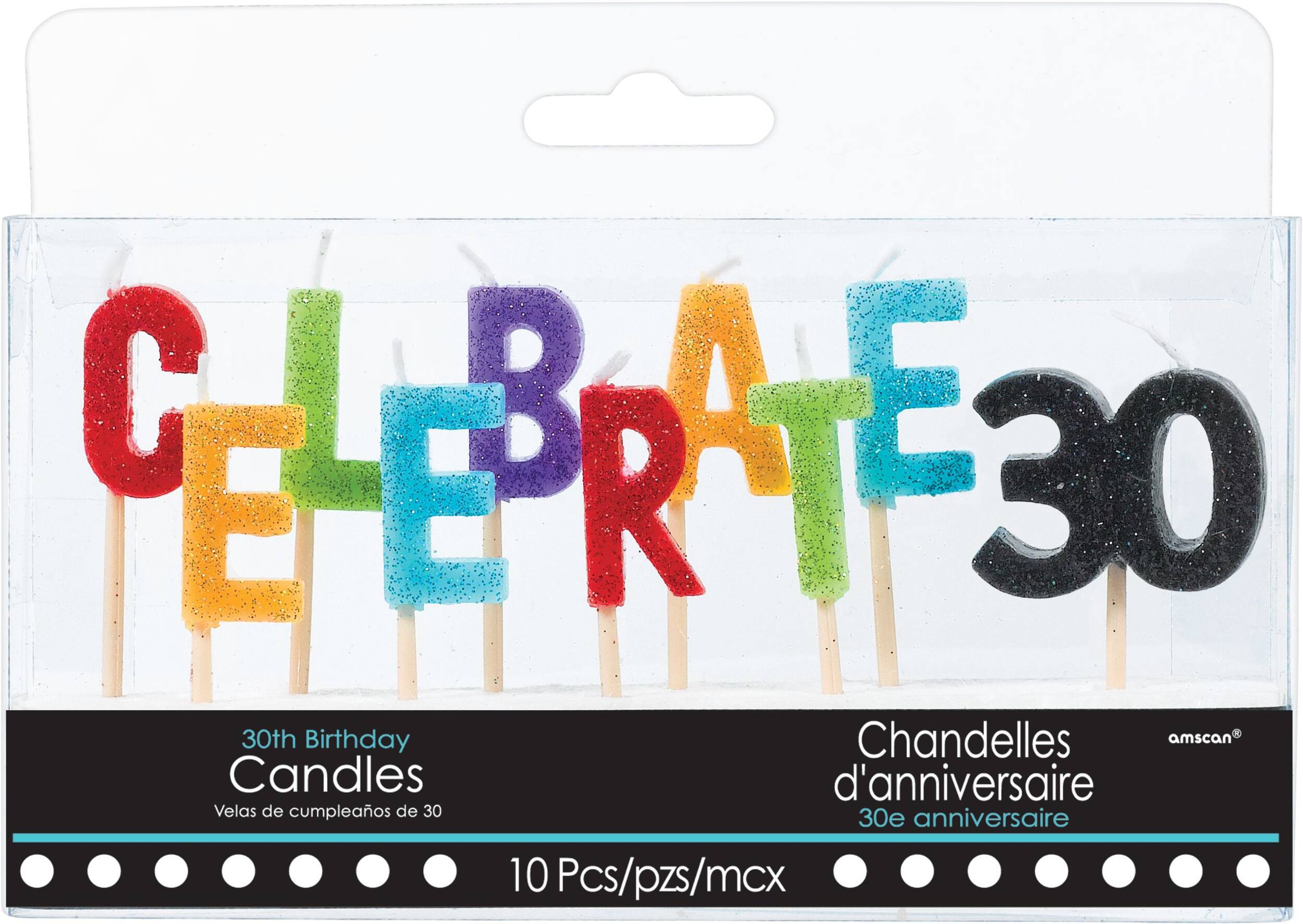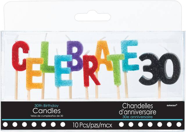 Perfect for a rainbow party theme, these letter candle picks spell out "Celebrate 30" and feature a stunning glitter finish