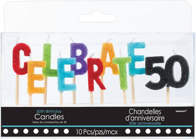 Perfect for a rainbow party theme, these letter candle picks spell out "Celebrate 50" and feature a stunning glitter finish