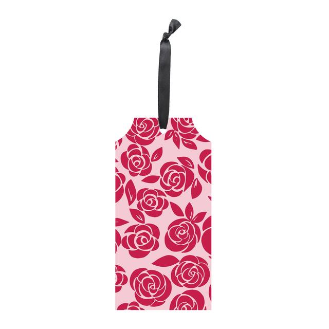 The tag is decorated with pink roses and has an attached ribbon that allows it to hang from a bottle's neck
