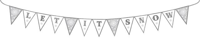 Each word on the banner has a gray pennant flag on either side of it with white snowflake designs and a silver glitter border
