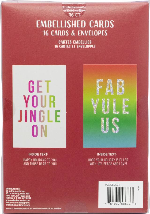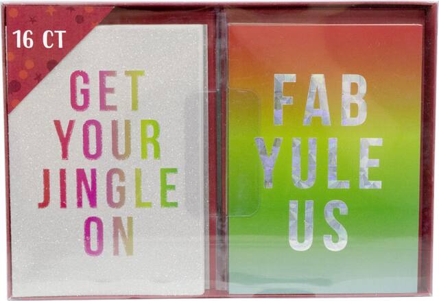 You may be interested in these similar products shown below.Glitter Multicolour Holiday Cards let you send either a "Get Your Jingle On" or "FabYULEus" design, each covered in glitter and vibrant colours