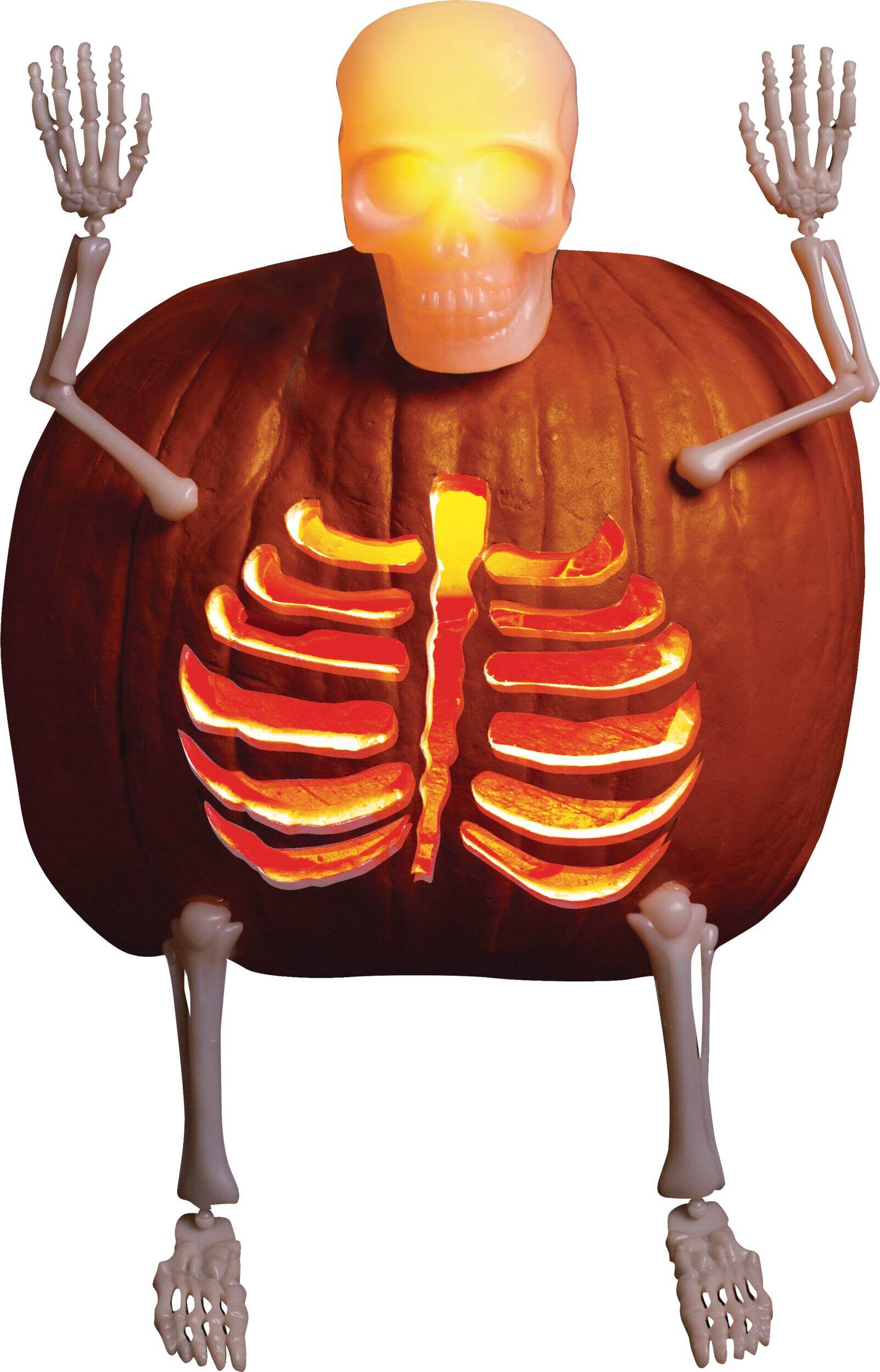 Includes 1 light-up skeleton head, skeleton arms, 2 skeleton feet, 1 carver, 1 scoop, and 1 stencil