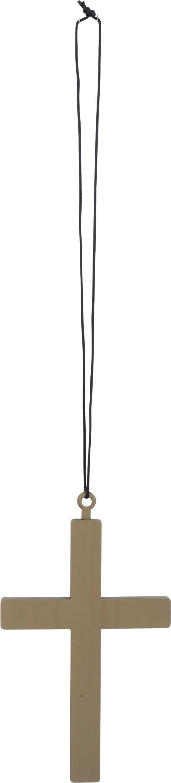 Elevate your costume with the elegant Gold Cross Necklace. This accessory features a classic gold cross pendant hanging from a sleek black nylon cord, perfect for completing a priest or nun costume. Add a touch of authenticity and style to your outfit with this timeless piece.