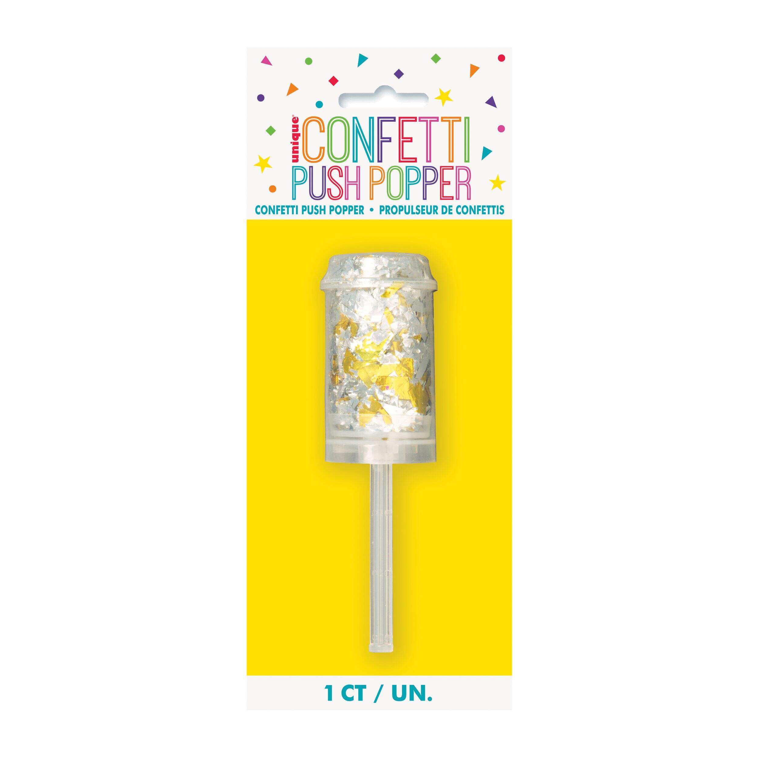 To use, be sure not to remove the popper's cap, and then hold the lower part of the popper upright. Then, when the time is right, push the stick at the bottom up forcefully to launch the confetti pieces up in the air