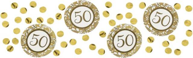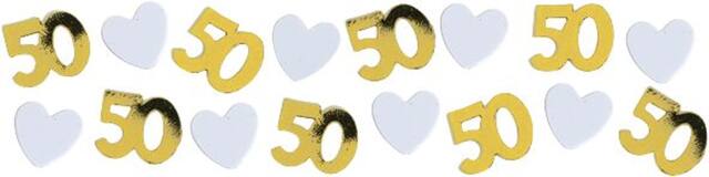 • Golden 50th Anniversary Confetti feature four designs in gold and white