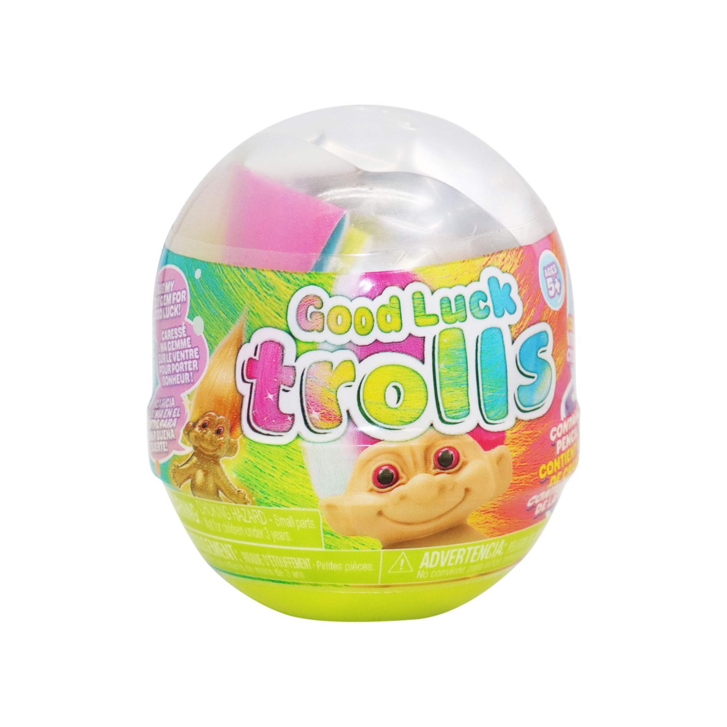 Capsule measures 2"x 2" (5.08 x 5.08 cm) and troll measures 1.5" wide x 4" tall (3.81 x 10.16 cm) with their hair up