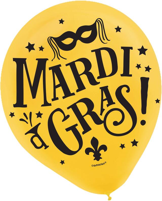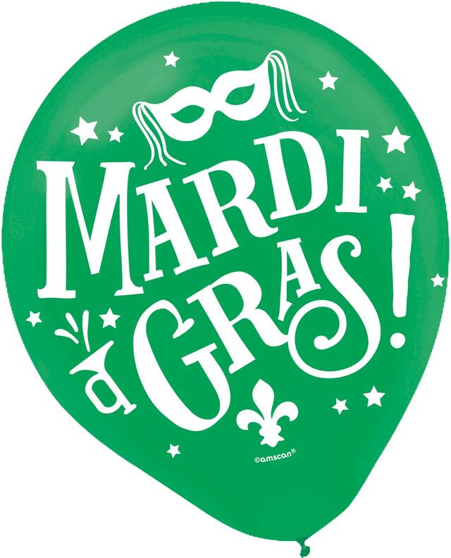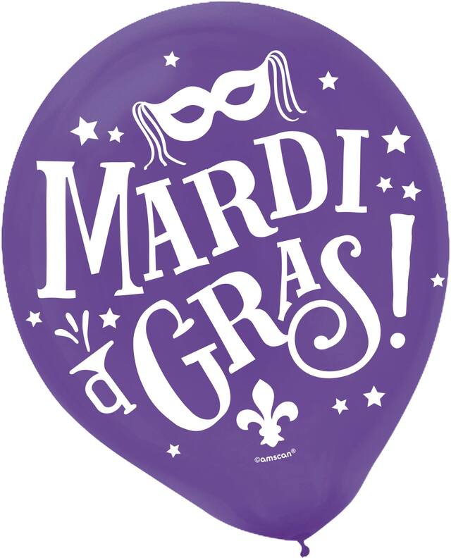 Latex balloons include solid gold green and purple plus the same colours with "Mardi Gras!" headlines and Mardi Gras-themed designs