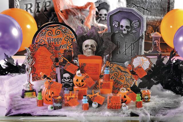 A gothic scrollwork pattern of ghosts, bats, spiders and pumpkins with a "Join Us if You Dare" headline sets the tone for spooky fun