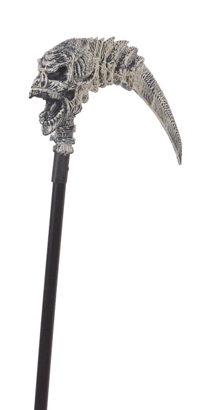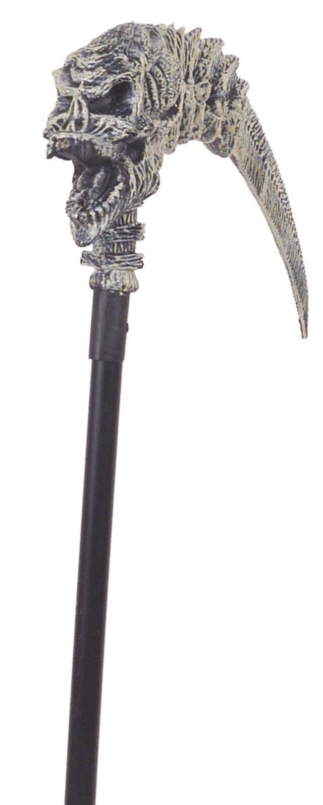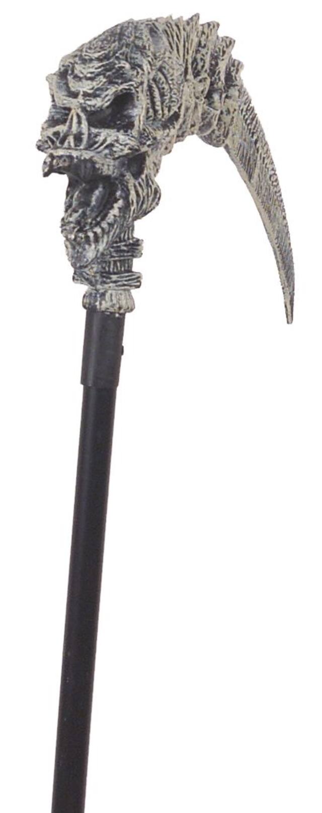 You may be interested in these similar products shown below.Reap the grimmest harvest ever. This unusual Grim Reaper Scythe features a creepy silver skull scythe blade with fishbone-like detail. The skull's mouth hangs wide open in a scream for an extra touch of horror. This Grim Reaper Scythe includes a two-piece black plastic pole that twists together. Recommended for ages 7 and up.