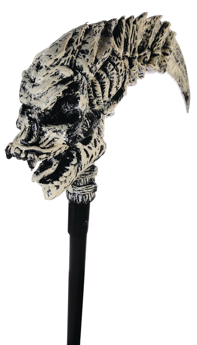 unusual Grim Reaper Scythe features a creepy silver skull scythe blade with fishbone-like detail