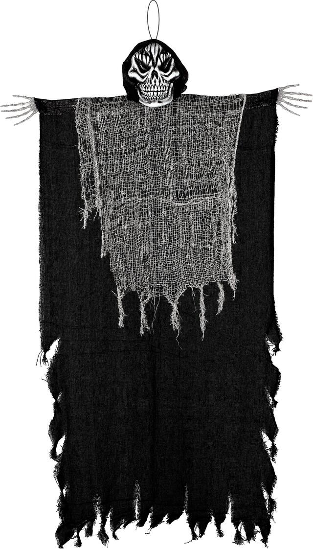 Grim reaper decoration features a plastic grim reaper face and skeleton fingers draped in a black and gray tattered cloak