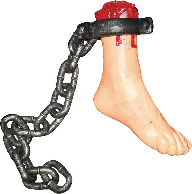 Chain is detailed to look like tarnished metal and is attached to a foot that has been chopped off at the ankle