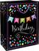 • Happy Birthday Banner Gift Bag is a glossy black bag with purple rope handles features a colourful banner with the headline “Happy Birthday” in the centre